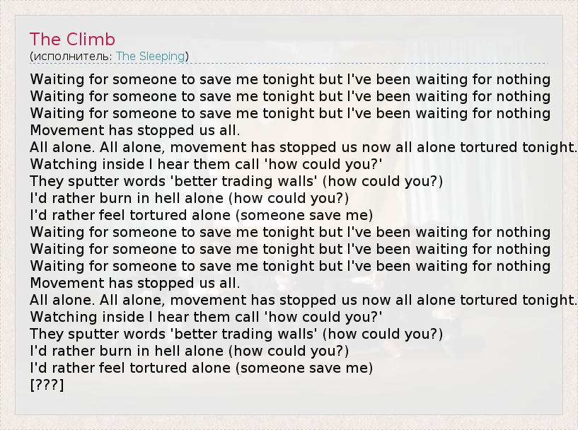 Waiting for someone to save me tonight but I've been waiting for nothing Waiting for someone to save me tonight but I've been waiting for nothing Waiting for someone to save me tonight but I've been waiting for nothing Movement has stopped us all. All alone. All alone, movement has stopped us now all alone tortured tonight. Watching inside I hear them call 'how could you?' They sputter words 'better trading walls' (how could you?) I'd rather burn in hell alone (how could you?) I'd rather feel tortured alone (someone save me) Waiting for someone to save me tonight but I've been waiting for nothing Waiting for someone to save me tonight but I've been waiting for nothing Waiting for someone to save me tonight but I've been waiting for nothing Movement has stopped us all. All alone. All alone, movement has stopped us now all alone tortured tonight. Watching inside I hear them call 'how could you?' They sputter words 'better trading walls' (how could you?) I'd rather burn in hell alone (how could you?) I'd rather feel tortured alone (someone save me) [???]