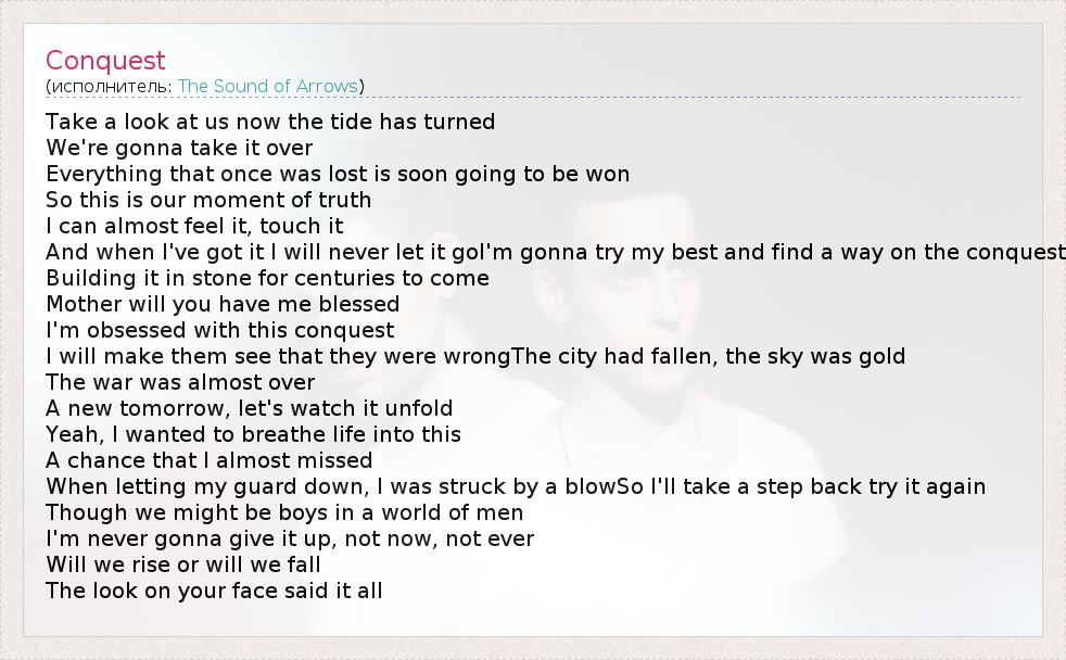Take a look at us now the tide has turned We're gonna take it over Everything that once was lost is soon going to be won So this is our moment of truth I can almost feel it, touch it And when I've got it I will never let it goI'm gonna try my best and find a way on the conquest Building it in stone for centuries to come Mother will you have me blessed I'm obsessed with this conquest I will make them see that they were wrongThe city had fallen, the sky was gold The war was almost over A new tomorrow, let's watch it unfold Yeah, I wanted to breathe life into this A chance that I almost missed When letting my guard down, I was struck by a blowSo I'll take a step back try it again Though we might be boys in a world of men I'm never gonna give it up, not now, not ever Will we rise or will we fall The look on your face said it all