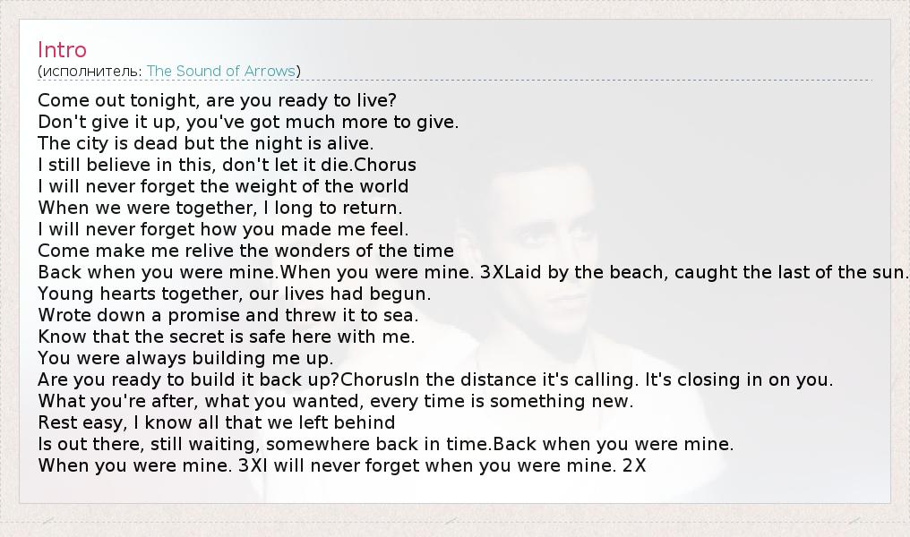Come out tonight, are you ready to live? Don't give it up, you've got much more to give. The city is dead but the night is alive. I still believe in this, don't let it die.Chorus I will never forget the weight of the world When we were together, I long to return. I will never forget how you made me feel. Come make me relive the wonders of the time Back when you were mine.When you were mine. 3XLaid by the beach, caught the last of the sun. Young hearts together, our lives had begun. Wrote down a promise and threw it to sea. Know that the secret is safe here with me. You were always building me up. Are you ready to build it back up?ChorusIn the distance it's calling. It's closing in on you. What you're after, what you wanted, every time is something new. Rest easy, I know all that we left behind Is out there, still waiting, somewhere back in time.Back when you were mine. When you were mine. 3XI will never forget when you were mine. 2X