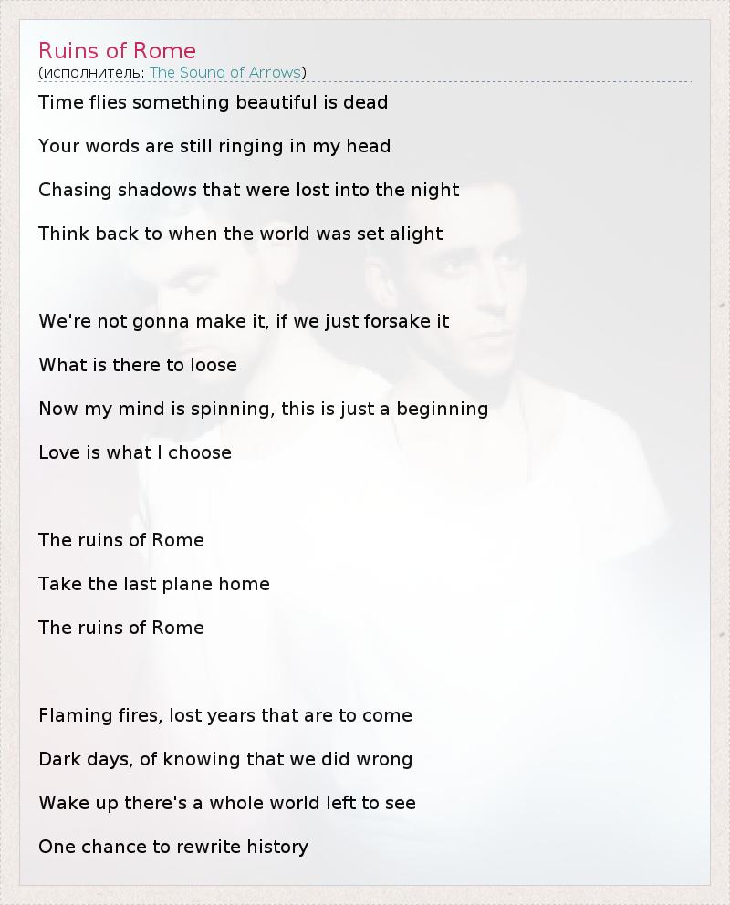 Time flies something beautiful is dead Your words are still ringing in my head Chasing shadows that were lost into the night Think back to when the world was set alight We're not gonna make it, if we just forsake it What is there to loose Now my mind is spinning, this is just a beginning Love is what I choose The ruins of Rome Take the last plane home The ruins of Rome Flaming fires, lost years that are to come Dark days, of knowing that we did wrong Wake up there's a whole world left to see One chance to rewrite history