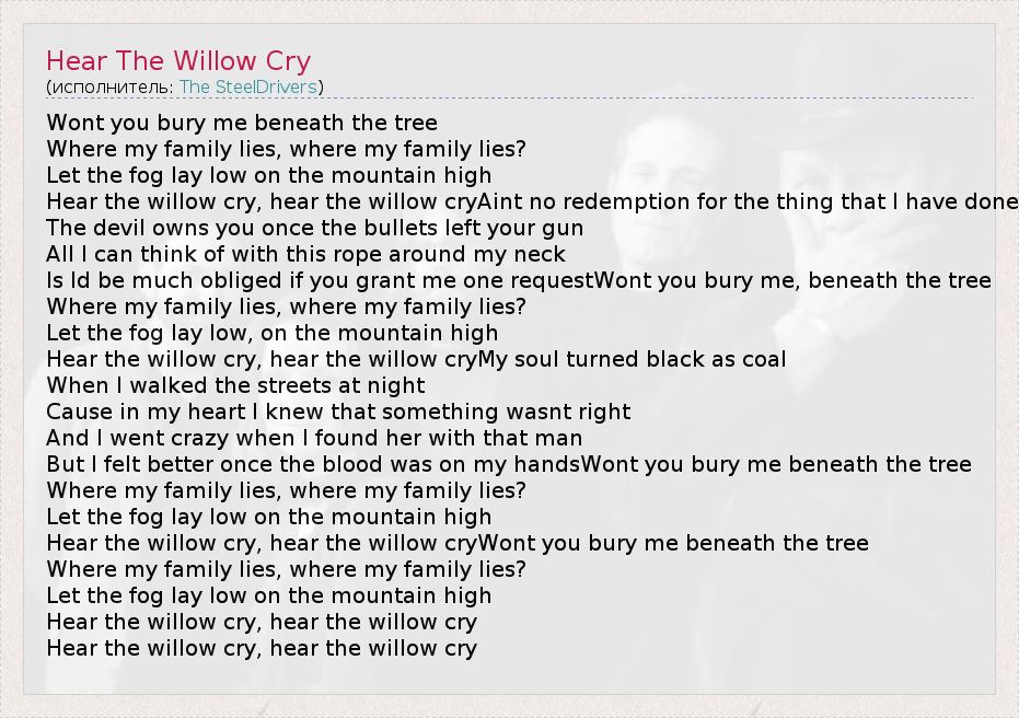 Wont you bury me beneath the tree Where my family lies, where my family lies? Let the fog lay low on the mountain high Hear the willow cry, hear the willow cryAint no redemption for the thing that I have done The devil owns you once the bullets left your gun All I can think of with this rope around my neck Is Id be much obliged if you grant me one requestWont you bury me, beneath the tree Where my family lies, where my family lies? Let the fog lay low, on the mountain high Hear the willow cry, hear the willow cryMy soul turned black as coal When I walked the streets at night Cause in my heart I knew that something wasnt right And I went crazy when I found her with that man But I felt better once the blood was on my handsWont you bury me beneath the tree Where my family lies, where my family lies? Let the fog lay low on the mountain high Hear the willow cry, hear the willow cryWont you bury me beneath the tree Where my family lies, where my family lies? Let the fog lay low on the mountain high Hear the willow cry, hear the willow cry Hear the willow cry, hear the willow cry