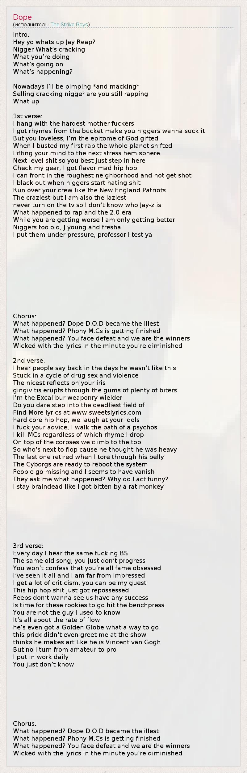 Intro: Hey yo whats up Jay Reap? Nigger What’s cracking What you’re doing What’s going on What’s happening? Nowadays I’ll be pimping *and macking* Selling cracking nigger are you still rapping What up 1st verse: I hang with the hardest mother fuckers I got rhymes from the bucket make you niggers wanna suck it But you loveless, I'm the epitome of God gifted When I busted my first rap the whole planet shifted Lifting your mind to the next stress hemisphere Next level shit so you best just step in here Check my gear, I got flavor mad hip hop I can front in the roughest neighborhood and not get shot I black out when niggers start hating shit Run over your crew like the New England Patriots The craziest but I am also the laziest never turn on the tv so I don't know who Jay-z is What happened to rap and the 2.0 era While you are getting worse I am only getting better Niggers too old, J young and fresha' I put them under pressure, professor I test ya Chorus: What happened? Dope D.O.D became the illest What happened? Phony M.Cs is getting finished What happened? You face defeat and we are the winners Wicked with the lyrics in the minute you're diminished 2nd verse: I hear people say back in the days he wasn’t like this Stuck in a cycle of drug sex and violence The nicest reflects on your iris gingivitis erupts through the gums of plenty of biters I'm the Excalibur weaponry wielder Do you dare step into the deadliest field of Find More lyrics at www.sweetslyrics.com hard core hip hop, we laugh at your idols I fuck your advice, I walk the path of a psychos I kill MCs regardless of which rhyme I drop On top of the corpses we climb to the top So who's next to flop cause he thought he was heavy The last one retired when I tore through his belly The Cyborgs are ready to reboot the system People go missing and I seems to have vanish They ask me what happened? Why do I act funny? I stay braindead like I got bitten by a rat monkey 3rd verse: Every day I hear the same fucking BS The same old song, you just don’t progress You won’t confess that you’re all fame obsessed I’ve seen it all and I am far from impressed I get a lot of criticism, you can be my guest This hip hop shit just got repossessed Peeps don’t wanna see us have any success Is time for these rookies to go hit the benchpress You are not the guy I used to know It’s all about the rate of flow he's even got a Golden Globe what a way to go this prick didn't even greet me at the show thinks he makes art like he is Vincent van Gogh But no I turn from amateur to pro I put in work daily You just don’t know Chorus: What happened? Dope D.O.D became the illest What happened? Phony M.Cs is getting finished What happened? You face defeat and we are the winners Wicked with the lyrics in the minute you're diminished