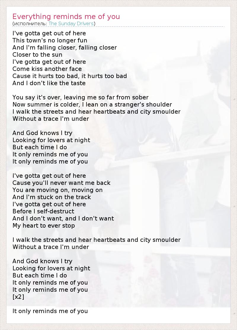 Мне нужно выбраться отсюда – В этом городе больше нет ничего хорошего, И я приближаюсь, приближаюсь все быстрее К концу пропасти. Мне нужно выбраться отсюда, Поцеловать кого-то другого, Потому что мне очень больно, очень больно, И я не люблю вкус чужих губ. Ты сказал, что между нами все кончено, это не помогло мне протрезветь. Лето стало холоднее, я опираюсь на незнакомое плечо, Шагаю по улицам, чувствуя сердцебиение, и город растворяется в сером дыму, Я бесследно исчезаю в нем. И знает Бог, я пытался Скрасить свое одиночество, Но, каждый раз, когда я был готов переступить черту, Это лишь напоминало мне о тебе, Это лишь напоминало мне о тебе. Мне нужно выбраться отсюда – Ведь ты не захочешь меня обратно, Твоя жизнь продолжается, А я застыл на месте, Мне нужно выбраться отсюда – Перед тем, как я медленно убью сам себя. И я не хочу, и я не хочу, Чтобы мое сердце остановилось. Шагаю по улицам, чувствуя сердцебиение, и город растворяется в сером дыму, Я бесследно исчезаю в нем. И знает Бог, я пытался Скрасить свое одиночество, Но, каждый раз, когда я был готов переступить черту, Это лишь напоминало мне о тебе, Это лишь напоминало мне о тебе. [x2] Это только напоминает мне о тебе.