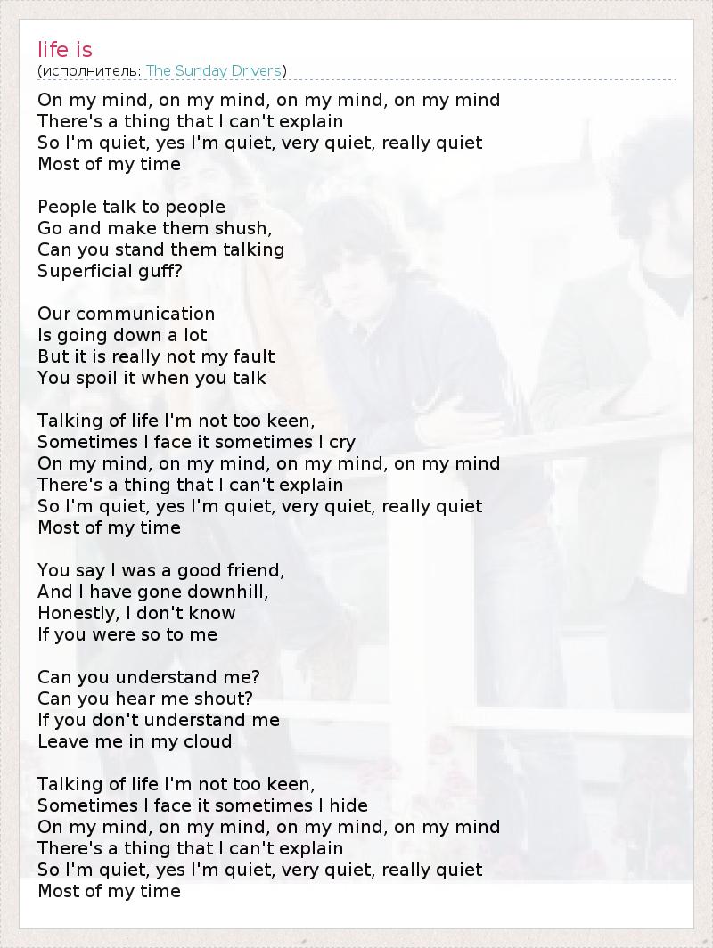У меня в голове вертится мысль, Которую я не в силах объяснить, Поэтому я отмалчиваюсь Большую часть времени. Люди говорят друг с другом, Пожалуйста, заставь их замолчать. Как ты выносишь Их поверхностный трёп! Наше общение Сошло на нет, Но это не моя вина, Это ты всё испортил, когда заговорил. Все эти разговоры о жизни, я не очень-то их люблю, Иногда я приемлю их, а иногда я просто плАчу... У меня в голове вертится мысль, Которую я не в силах объяснить, Поэтому я отмалчиваюсь Большую часть времени. Ты говоришь, что раньше я был хорошим другом, А теперь качусь по наклонной плоскости. Но в сущности, я не уверен, Что ты был хорошим другом для меня. Можешь ли ты понять меня? Можешь ли услышать меня, даже если буду орать тебе в ухо? Если ты не понимаешь меня вовсе, То лучше оставь меня наедине с моими мечтами. Все эти разговоры о жизни, я не очень-то их люблю, Иногда я приемлю их, а иногда ищу от них убежище... У меня в голове вертится мысль, Которую я не в силах объяснить, Поэтому я отмалчиваюсь Большую часть времени.