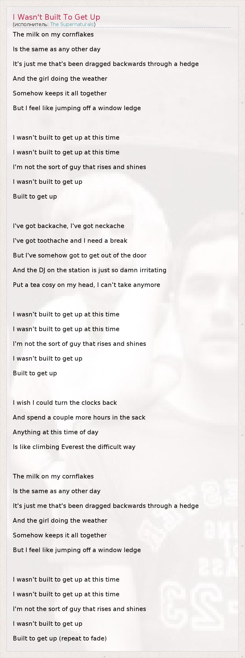 The milk on my cornflakes Is the same as any other day It's just me that's been dragged backwards through a hedge And the girl doing the weather Somehow keeps it all together But I feel like jumping off a window ledge I wasn't built to get up at this time I wasn't built to get up at this time I'm not the sort of guy that rises and shines I wasn't built to get up Built to get up I've got backache, I've got neckache I've got toothache and I need a break But I've somehow got to get out of the door And the DJ on the station is just so damn irritating Put a tea cosy on my head, I can't take anymore I wasn't built to get up at this time I wasn't built to get up at this time I'm not the sort of guy that rises and shines I wasn't built to get up Built to get up I wish I could turn the clocks back And spend a couple more hours in the sack Anything at this time of day Is like climbing Everest the difficult way The milk on my cornflakes Is the same as any other day It's just me that's been dragged backwards through a hedge And the girl doing the weather Somehow keeps it all together But I feel like jumping off a window ledge I wasn't built to get up at this time I wasn't built to get up at this time I'm not the sort of guy that rises and shines I wasn't built to get up Built to get up (repeat to fade)