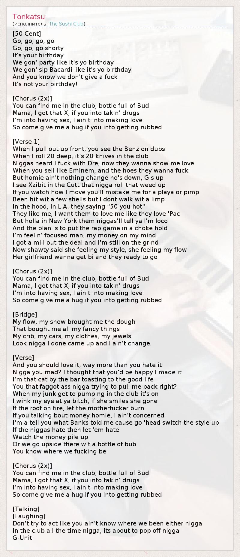 [50 Cent] Вперёд, вперёд, Вперёд, цыпа: Сегодня у тебя день рождения. Мы будем веселиться так, словно у тебя день рождения. Мы будем пить Бакарди, как на твоём дне рождения. Но, знай, нам наплевать, Что сегодня не твой день рождения. [Припев: 2x] Ты найдёшь меня в клубе с бутылкой шампанского. Смотри, малышка, у меня есть таблетка экстази, если тебе нужно. Я здесь занимаюсь сексом, а не любовью. Поэтому подойди и обними меня, если хочешь, чтобы тебя приласкали. [1-ый куплет:] Когда я обгоняю тебя, ты видишь мерс, из которого доносятся звуки регги. Когда я говорю, мой раскатистый голос пронзает слух всех присутствующих. Ниг*еры где-то прослышали, что у меня дела с Дре, и теперь хотят показать, как сильно меня любят. Когда ты поёшь, как Эминем, тебя хотят все тёлки без исключения. Друг, ничего не изменилось: чем больше у тебя бабла, тем лучше тёлки. В поле моего зрения попал Xzibit: этот ниг*ер забивает косячок. Если вы за мной понаблюдаете, то можете принять меня за игрока или сутенёра - Несколько раз в меня стреляли, но я не хромаю. Девочки, живущие по соседству со мной, говорят: "50, ты секси". Я им нравлюсь. Я хочу, чтобы они меня любили так же, как и Тупака. Но в Нью-Йорке ниг*еры скажут вам, что я псих, Потому что хочу взять всю рэп-сцену под свой жёсткий контроль. Я сконцентрировался на главном, у меня на уме деньги. Я уже наварил миллион, но это ещё не предел. Киска только что сказала, что она чувствует мой стиль и понимает ход моих мыслей. Пусть она возьмёт с собой подружку, и мы начнём (Да, хорошо). [Припев: 2x] Ты найдёшь меня в клубе с бутылкой шампанского. Смотри, малышка, у меня есть таблетка экстази, если тебе нужно. Я здесь занимаюсь сексом, а не любовью. Поэтому подойди и обними меня, если хочешь, чтобы тебя приласкали. [Переход:] Мой рэп и моё шоу принесли мне бабки, На которые я приобрёл всё, о чём только мечтал: Дом, машины, бассейны, драгоценности. Смотри, нигер, я теперь крутой, но я не изменился. [2-ой куплет:] Это должно тебе скорее нравиться, чем нет. Ниг*ер, ты чокнутый? я думал, что ты будешь рад, что я этого добился. Я сижу в баре и пью за хорошую жизнь. А ты, недоумок, ниг*ер-тупица, пытаешься остановить меня. Когда в клубе врубят мой музон, начнётся отрыв по полной. Я подмигиваю твоей тёлке: если она улыбнётся, она пропала, Потому что ты не станешь терпеть даже подозрения в измене. Если ты говоришь о деньгах, друг, меня это не касается. Я скажу тебе, что сказал мне Banks: "Не останавливайся, набирай оборотов". Если нигерам это не понравится, пускай бесятся, А сам в это время срубай как можно больше бабок, Тогда, распивая шампанское, мы пойдём в гору, Ну, ты сам знаешь, куда... [Припев: 2x] Ты найдёшь меня в клубе с бутылкой шампанского. Смотри, малышка, у меня есть таблетка экстази, если тебе нужно. Я здесь занимаюсь сексом, а не любовью. Поэтому подойди и обними меня, если хочешь, чтобы тебя приласкали. [Разговор:] [Смех:] Ха, ха, ха, ха. Не веди себя так, словно ты не знаешь, что мы ниг*еры. Мы постоянно в клубе, нигер. Веселье только начинается, брат. G-Unit!