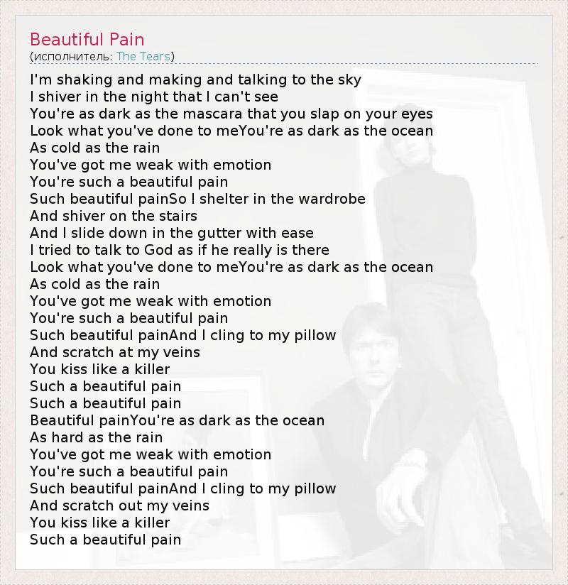 I'm shaking and making and talking to the sky I shiver in the night that I can't see You're as dark as the mascara that you slap on your eyes Look what you've done to meYou're as dark as the ocean As cold as the rain You've got me weak with emotion You're such a beautiful pain Such beautiful painSo I shelter in the wardrobe And shiver on the stairs And I slide down in the gutter with ease I tried to talk to God as if he really is there Look what you've done to meYou're as dark as the ocean As cold as the rain You've got me weak with emotion You're such a beautiful pain Such beautiful painAnd I cling to my pillow And scratch at my veins You kiss like a killer Such a beautiful pain Such a beautiful pain Beautiful painYou're as dark as the ocean As hard as the rain You've got me weak with emotion You're such a beautiful pain Such beautiful painAnd I cling to my pillow And scratch out my veins You kiss like a killer Such a beautiful pain