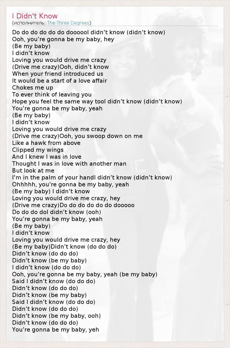 Do do do do do do doooooI didn't know (didn't know) Ooh, you're gonna be my baby, hey (Be my baby) I didn't know Loving you would drive me crazy (Drive me crazy)Ooh, didn't know When your friend introduced us It would be a start of a love affair Chokes me up To ever think of leaving you Hope you feel the same way tooI didn't know (didn't know) You're gonna be my baby, yeah (Be my baby) I didn't know Loving you would drive me crazy (Drive me crazy)Ooh, you swoop down on me Like a hawk from above Clipped my wings And I knew I was in love Thought I was in love with another man But look at me I'm in the palm of your handI didn't know (didn't know) Ohhhhh, you're gonna be my baby, yeah (Be my baby) I didn't know Loving you would drive me crazy, hey (Drive me crazy)Do do do do do do dooooo Do do do doI didn't know (ooh) You're gonna be my baby, yeah (Be my baby) I didn't know Loving you would drive me crazy, hey (Be my baby)Didn't know (do do do) Didn't know (do do do) Didn't know (be my baby) I didn't know (do do do) Ooh, you're gonna be my baby, yeah (be my baby) Said I didn't know (do do do) Didn't know (do do do) Didn't know (be my baby) Said I didn't know (do do do) Didn't know (do do do) Didn't know (be my baby, ooh) Didn't know (do do do) You're gonna be my baby, yeh