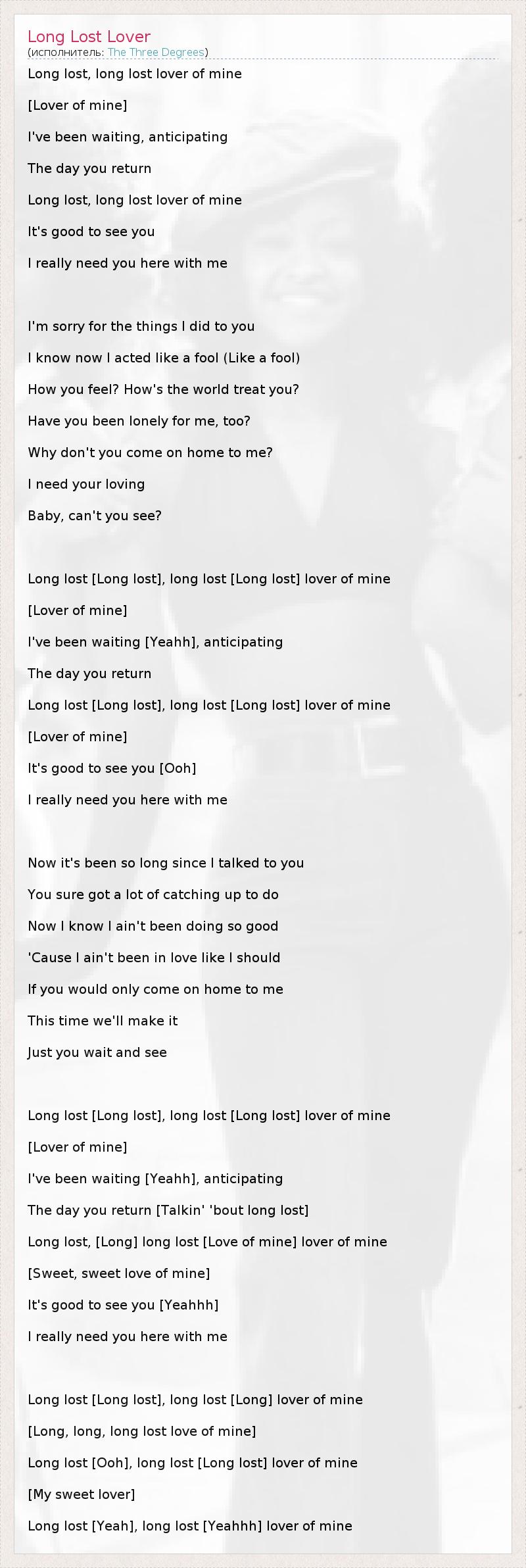 Long lost, long lost lover of mine [Lover of mine] I've been waiting, anticipating The day you return Long lost, long lost lover of mine It's good to see you I really need you here with me I'm sorry for the things I did to you I know now I acted like a fool (Like a fool) How you feel? How's the world treat you? Have you been lonely for me, too? Why don't you come on home to me? I need your loving Baby, can't you see? Long lost [Long lost], long lost [Long lost] lover of mine [Lover of mine] I've been waiting [Yeahh], anticipating The day you return Long lost [Long lost], long lost [Long lost] lover of mine [Lover of mine] It's good to see you [Ooh] I really need you here with me Now it's been so long since I talked to you You sure got a lot of catching up to do Now I know I ain't been doing so good 'Cause I ain't been in love like I should If you would only come on home to me This time we'll make it Just you wait and see Long lost [Long lost], long lost [Long lost] lover of mine [Lover of mine] I've been waiting [Yeahh], anticipating The day you return [Talkin' 'bout long lost] Long lost, [Long] long lost [Love of mine] lover of mine [Sweet, sweet love of mine] It's good to see you [Yeahhh] I really need you here with me Long lost [Long lost], long lost [Long] lover of mine [Long, long, long lost love of mine] Long lost [Ooh], long lost [Long lost] lover of mine [My sweet lover] Long lost [Yeah], long lost [Yeahhh] lover of mine