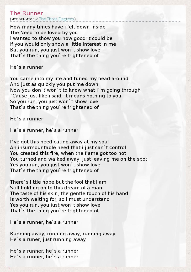 How many times have i felt down inside The Need to be loved by you I wanted to show you how good it could be If you would only show a little interest in me Bat you run, you just won`t show love That`s the thing you`re frightened of He`s a runner You came into my life and tuned my head around And just as quickly you put me down Now you don`t won`t to know what I`m going through `Cause just like i said, it means nothing to you So you run, you just won`t show love That`s the thing you`re frightened of He`s a runner He`s a runner, he`s a runner I`ve got this need cating away at my soul An insurmountable need that i just can`t control You created this fire, when the flame got too hot You turned and walked away, just leaving me on the spot Yes you run, you just won`t show love That`s the thing you`re frightened of There`s little hope but the fool that I am Still holding on to this dream of a man The taste of his skin, the gentle touch of his hand Is worth waiting for, so I must understand Yes you run, you just won`t show love That`s the thing you`re frightened of He`s a runner, he`s a runner Running away, running away, running away He`s a runer, just running away He`s a runner, he`s a runner He`s a runner, he`s a runner