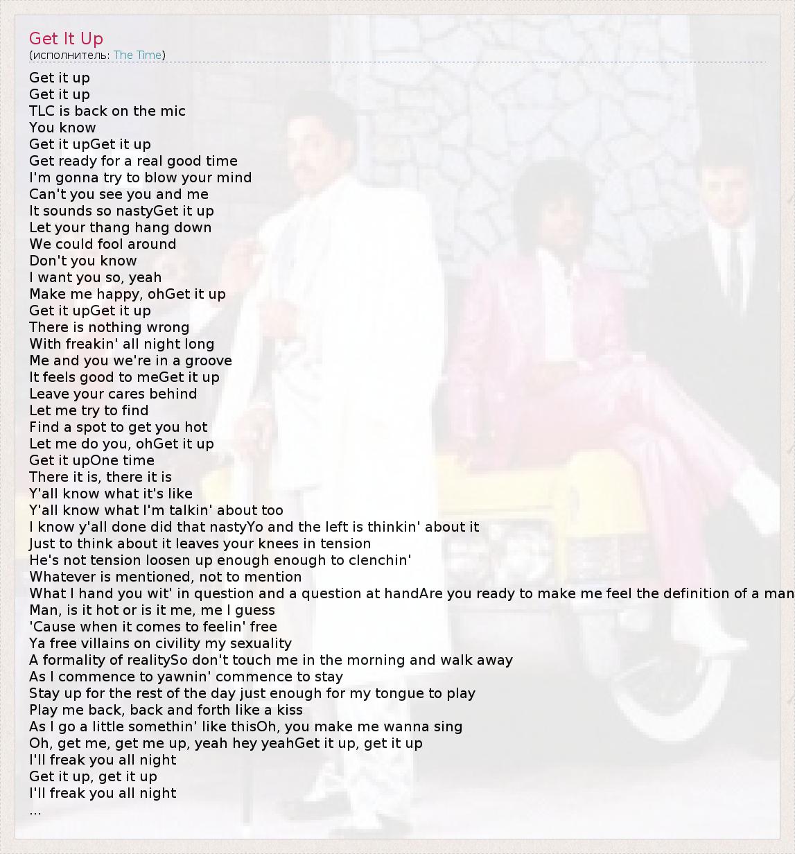 Get it up Get it up TLC is back on the mic You know Get it upGet it up Get ready for a real good time I'm gonna try to blow your mind Can't you see you and me It sounds so nastyGet it up Let your thang hang down We could fool around Don't you know I want you so, yeah Make me happy, ohGet it up Get it upGet it up There is nothing wrong With freakin' all night long Me and you we're in a groove It feels good to meGet it up Leave your cares behind Let me try to find Find a spot to get you hot Let me do you, ohGet it up Get it upOne time There it is, there it is Y'all know what it's like Y'all know what I'm talkin' about too I know y'all done did that nastyYo and the left is thinkin' about it Just to think about it leaves your knees in tension He's not tension loosen up enough enough to clenchin' Whatever is mentioned, not to mention What I hand you wit' in question and a question at handAre you ready to make me feel the definition of a man Man, is it hot or is it me, me I guess 'Cause when it comes to feelin' free Ya free villains on civility my sexuality A formality of realitySo don't touch me in the morning and walk away As I commence to yawnin' commence to stay Stay up for the rest of the day just enough for my tongue to play Play me back, back and forth like a kiss As I go a little somethin' like thisOh, you make me wanna sing Oh, get me, get me up, yeah hey yeahGet it up, get it up I'll freak you all night Get it up, get it up I'll freak you all night ...