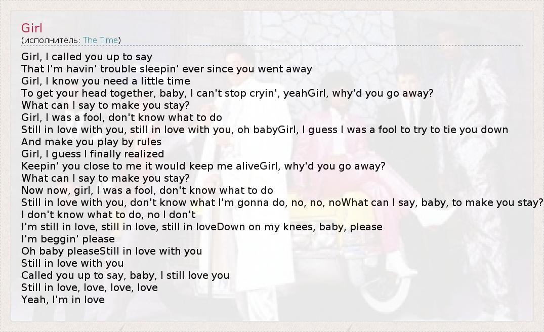 Girl, I called you up to say That I'm havin' trouble sleepin' ever since you went away Girl, I know you need a little time To get your head together, baby, I can't stop cryin', yeahGirl, why'd you go away? What can I say to make you stay? Girl, I was a fool, don't know what to do Still in love with you, still in love with you, oh babyGirl, I guess I was a fool to try to tie you down And make you play by rules Girl, I guess I finally realized Keepin' you close to me it would keep me aliveGirl, why'd you go away? What can I say to make you stay? Now now, girl, I was a fool, don't know what to do Still in love with you, don't know what I'm gonna do, no, no, noWhat can I say, baby, to make you stay? I don't know what to do, no I don't I'm still in love, still in love, still in loveDown on my knees, baby, please I'm beggin' please Oh baby pleaseStill in love with you Still in love with you Called you up to say, baby, I still love you Still in love, love, love, love Yeah, I'm in love