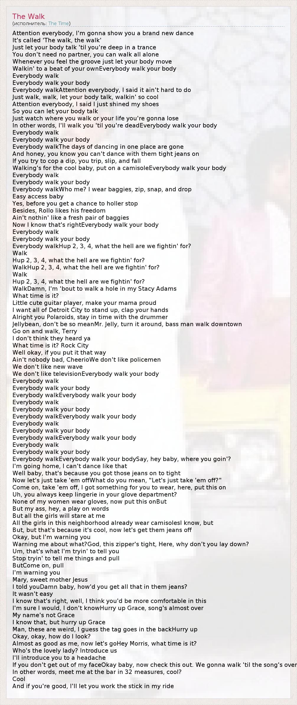 Attention everybody, I'm gonna show you a brand new dance It's called 'The walk, the walk' Just let your body talk 'til you're deep in a trance You don't need no partner, you can walk all alone Whenever you feel the groove just let your body move Walkin' to a beat of your ownEverybody walk your body Everybody walk Everybody walk your body Everybody walkAttention everybody, I said it ain't hard to do Just walk, walk, let your body talk, walkin' so cool Attention everybody, I said I just shined my shoes So you can let your body talk Just watch where you walk or your life you're gonna lose In other words, I'll walk you 'til you're deadEverybody walk your body Everybody walk Everybody walk your body Everybody walkThe days of dancing in one place are gone And honey, you know you can't dance with them tight jeans on If you try to cop a dip, you trip, slip, and fall Walking's for the cool baby, put on a camisoleEverybody walk your body Everybody walk Everybody walk your body Everybody walkWho me? I wear baggies, zip, snap, and drop Easy access baby Yes, before you get a chance to holler stop Besides, Rollo likes his freedom Ain't nothin' like a fresh pair of baggies Now I know that's rightEverybody walk your body Everybody walk Everybody walk your body Everybody walkHup 2, 3, 4, what the hell are we fightin' for? Walk Hup 2, 3, 4, what the hell are we fightin' for? WalkHup 2, 3, 4, what the hell are we fightin' for? Walk Hup 2, 3, 4, what the hell are we fightin' for? WalkDamn, I'm 'bout to walk a hole in my Stacy Adams What time is it? Little cute guitar player, make your mama proud I want all of Detroit City to stand up, clap your hands Alright you Polaroids, stay in time with the drummer Jellybean, don't be so meanMr. Jelly, turn it around, bass man walk downtown Go on and walk, Terry I don't think they heard ya What time is it? Rock City Well okay, if you put it that way Ain't nobody bad, CheerioWe don't like policemen We don't like new wave We don't like televisionEverybody walk your body Everybody walk Everybody walk your body Everybody walkEverybody walk your body Everybody walk Everybody walk your body Everybody walkEverybody walk your body Everybody walk Everybody walk your body Everybody walkEverybody walk your body Everybody walk Everybody walk your body Everybody walkEverybody walk your bodySay, hey baby, where you goin'? I'm going home, I can't dance like that Well baby, that's because you got those jeans on to tight Now let's just take 'em offWhat do you mean, "Let's just take 'em off?" Come on, take 'em off, I got something for you to wear, here, put this on Uh, you always keep lingerie in your glove department? None of my women wear gloves, now put this onBut But my ass, hey, a play on words But all the girls will stare at me All the girls in this neighborhood already wear camisolesI know, but But, but that's because it's cool, now let's get them jeans off Okay, but I'm warning you Warning me about what?God, this zipper's tight, Here, why don't you lay down? Um, that's what I'm tryin' to tell you Stop tryin' to tell me things and pull ButCome on, pull I'm warning you Mary, sweet mother Jesus I told youDamn baby, how'd you get all that in them jeans? It wasn't easy I know that's right, well, I think you'd be more comfortable in this I'm sure I would, I don't knowHurry up Grace, song's almost over My name's not Grace I know that, but hurry up Grace Man, these are weird, I guess the tag goes in the backHurry up Okay, okay, how do I look? Almost as good as me, now let's goHey Morris, what time is it? Who's the lovely lady? Introduce us I'll introduce you to a headache If you don't get out of my faceOkay baby, now check this out. We gonna walk 'til the song's over In other words, meet me at the bar in 32 measures, cool? Cool And if you're good, I'll let you work the stick in my ride
