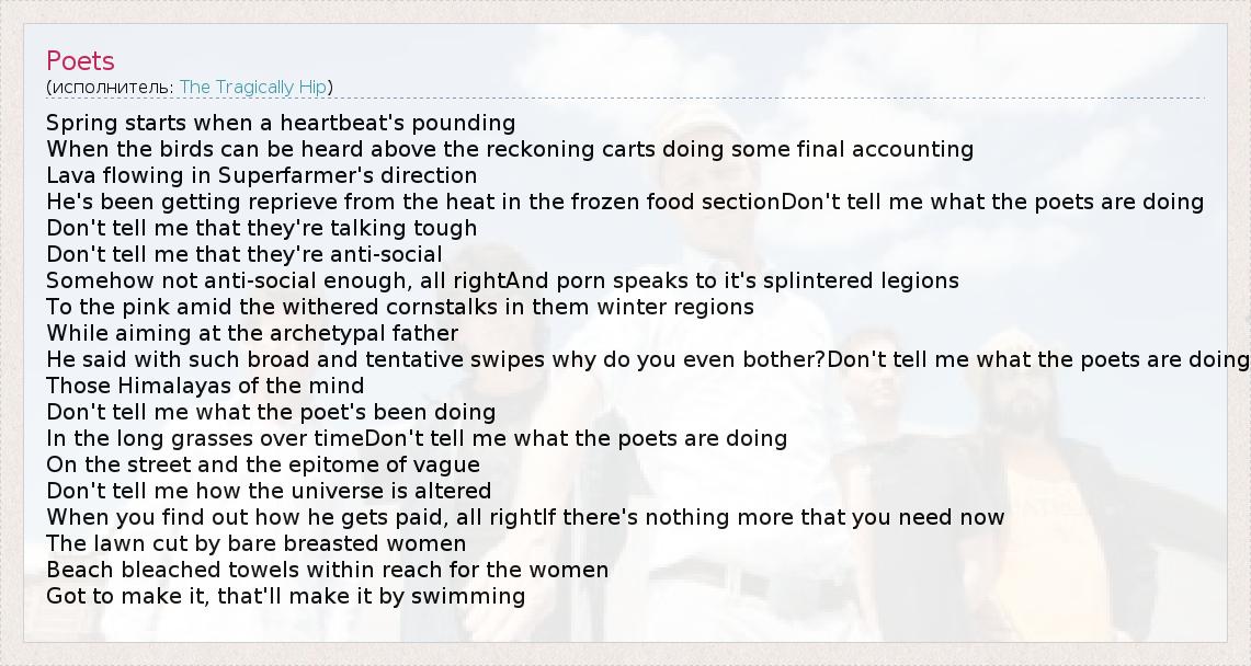 Это интересно:The Tragically Hip (часто просто The Hip) — канадская рок-группа, выступающая с 1983 года. За время существования The Tragically Hip выпустили 12 студийных и два концертных альбома и 46 синглов. Девять альбомов группы возглавляли канадские хит-парады, среди ее многочисленных наград 12 премий «Джуно» и Премия генерал-губернатора за карьерные достижения в области искусства.Группа сформировалась в 1983 году... продолжение