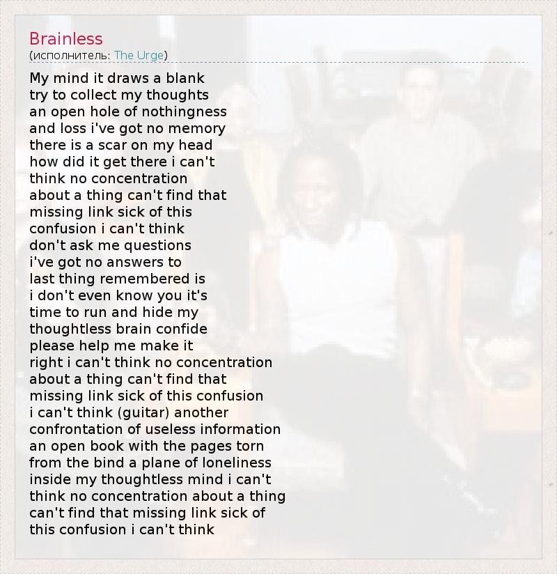 My mind it draws a blank try to collect my thoughts an open hole of nothingness and loss i've got no memory there is a scar on my head how did it get there i can't think no concentration about a thing can't find that missing link sick of this confusion i can't think don't ask me questions i've got no answers to last thing remembered is i don't even know you it's time to run and hide my thoughtless brain confide please help me make it right i can't think no concentration about a thing can't find that missing link sick of this confusion i can't think (guitar) another confrontation of useless information an open book with the pages torn from the bind a plane of loneliness inside my thoughtless mind i can't think no concentration about a thing can't find that missing link sick of this confusion i can't think