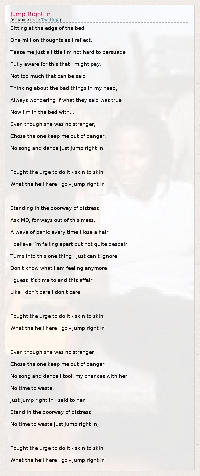 Sitting at the edge of the bed One million thoughts as I reflect. Tease me just a little I'm not hard to persuade Fully aware for this that I might pay. Not too much that can be said Thinking about the bad things in my head, Always wondering if what they said was true Now I'm in the bed with... Even though she was no stranger, Chose the one keep me out of danger. No song and dance just jump right in. Fought the urge to do it - skin to skin What the hell here I go - jump right in Standing in the doorway of distress Ask MD, for ways out of this mess, A wave of panic every time I lose a hair I believe I'm falling apart but not quite despair. Turns into this one thing I just can't ignore Don't know what I am feeling anymore I guess it's time to end this affair Like I don't care I don't care. Fought the urge to do it - skin to skin What the hell here I go - jump right in Even though she was no stranger Chose the one keep me out of danger No song and dance I took my chances with her No time to waste. Just jump right in I said to her Stand in the doorway of distress No time to waste just jump right in, Fought the urge to do it - skin to skin What the hell here I go - jump right in