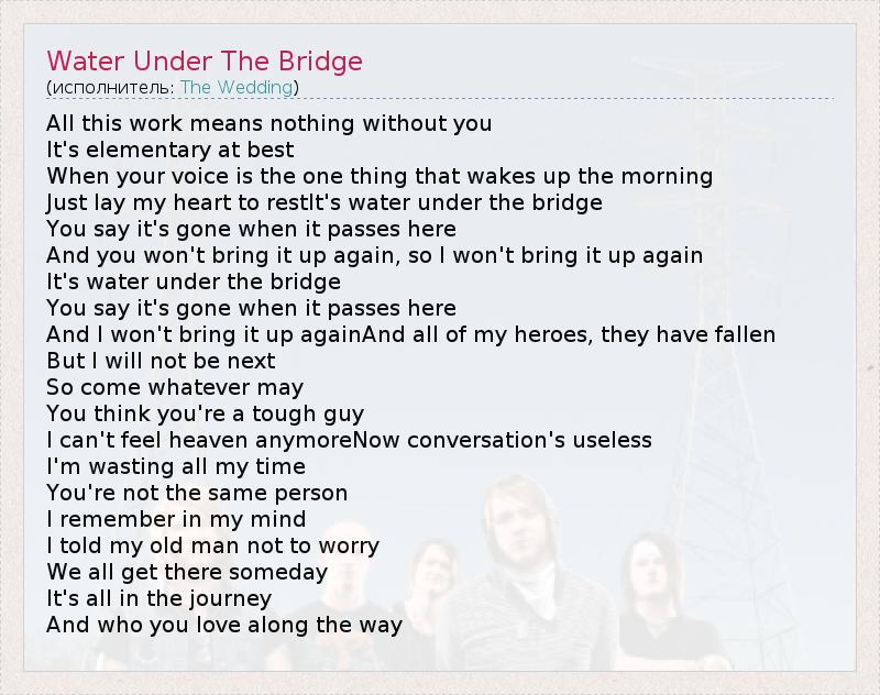 All this work means nothing without you It's elementary at best When your voice is the one thing that wakes up the morning Just lay my heart to restIt's water under the bridge You say it's gone when it passes here And you won't bring it up again, so I won't bring it up again It's water under the bridge You say it's gone when it passes here And I won't bring it up againAnd all of my heroes, they have fallen But I will not be next So come whatever may You think you're a tough guy I can't feel heaven anymoreNow conversation's useless I'm wasting all my time You're not the same person I remember in my mind I told my old man not to worry We all get there someday It's all in the journey And who you love along the way