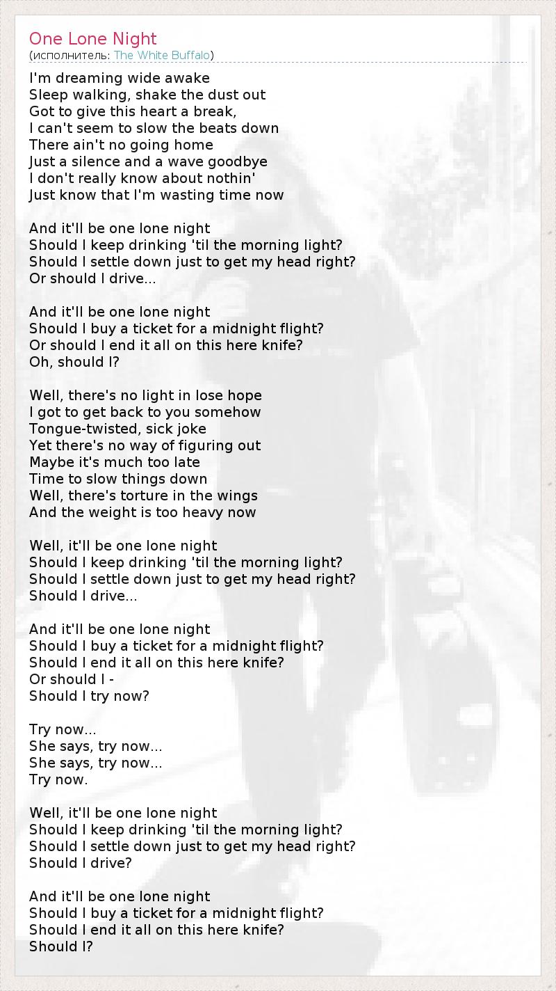 I'm dreaming wide awake Sleep walking, shake the dust out Got to give this heart a break, I can't seem to slow the beats down There ain't no going home Just a silence and a wave goodbye I don't really know about nothin' Just know that I'm wasting time now And it'll be one lone night Should I keep drinking 'til the morning light? Should I settle down just to get my head right? Or should I drive... And it'll be one lone night Should I buy a ticket for a midnight flight? Or should I end it all on this here knife? Oh, should I? Well, there's no light in lose hope I got to get back to you somehow Tongue-twisted, sick joke Yet there's no way of figuring out Maybe it's much too late Time to slow things down Well, there's torture in the wings And the weight is too heavy now Well, it'll be one lone night Should I keep drinking 'til the morning light? Should I settle down just to get my head right? Should I drive... And it'll be one lone night Should I buy a ticket for a midnight flight? Should I end it all on this here knife? Or should I - Should I try now? Try now... She says, try now... She says, try now... Try now. Well, it'll be one lone night Should I keep drinking 'til the morning light? Should I settle down just to get my head right? Should I drive? And it'll be one lone night Should I buy a ticket for a midnight flight? Should I end it all on this here knife? Should I?