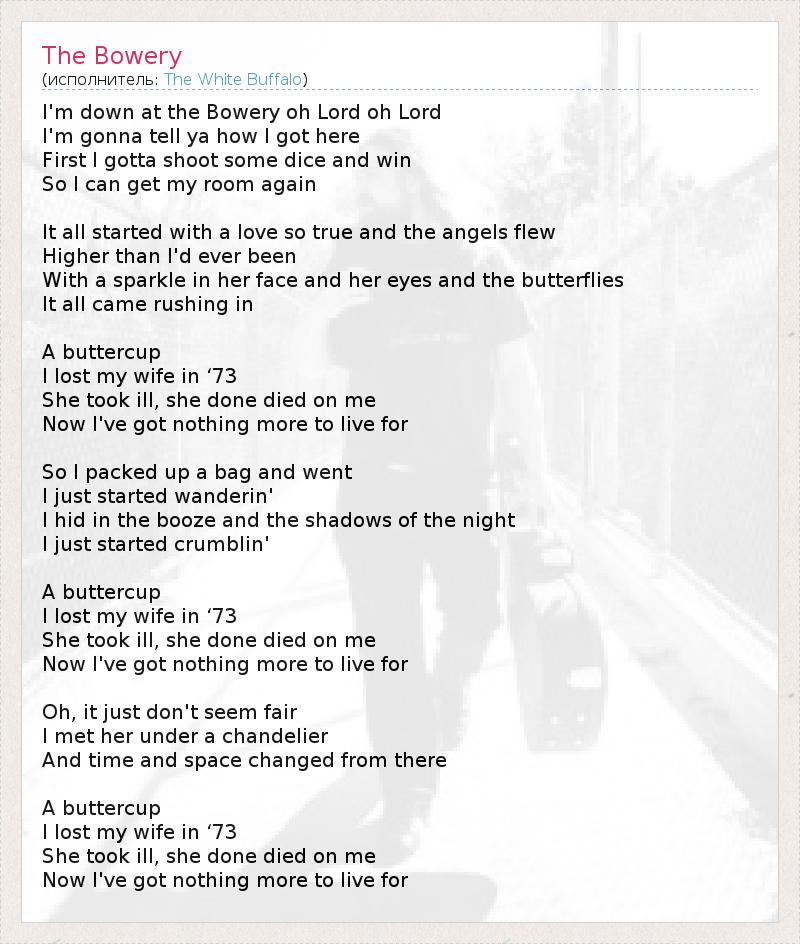 Я иду по Бауэри, 1 о Боже, о Боже, Я должен рассказать вам, как я сюда попал. Но сначала мне нужно побросать кости и выиграть, Чтобы снять тот самый номер. Все началось с настоящей любви, и ангелы летали Так высоко, как никогда. Ее лицо светилось, глаза сияли и бабочки порхали, 2 Все нахлынуло разом. Лютик... Я потерял свою жену в 73-ем. Она заболела и умерла у меня на руках, И теперь мне незачем жить. Так что я собрал сумку и ушел, Это было начало моих странствий. Я прятался в выпивке и ночных тенях, Я разрушал себя. Лютик... Я потерял свою жену в 73-ем. Она заболела и умерла у меня на руках, И теперь мне незачем жить. О, это так несправедливо... Я встретился с ней под этой люстрой, И тогда это изменило всю мою жизнь. Лютик... Я потерял свою жену в 73-ем. Она заболела и умерла у меня на руках, И теперь мне незачем жить. 1 - Бауэри – название улицы и прилегающего к ней одноимённого района в Нью-Йорке. Сейчас Бауэри известен недорогими гостиницами и барами. 2 - Имеется в виду выражение "butterflies in the stomach" (бабочки в животе) – идиома, означающая состояние влюбленности или позитивного волнения.