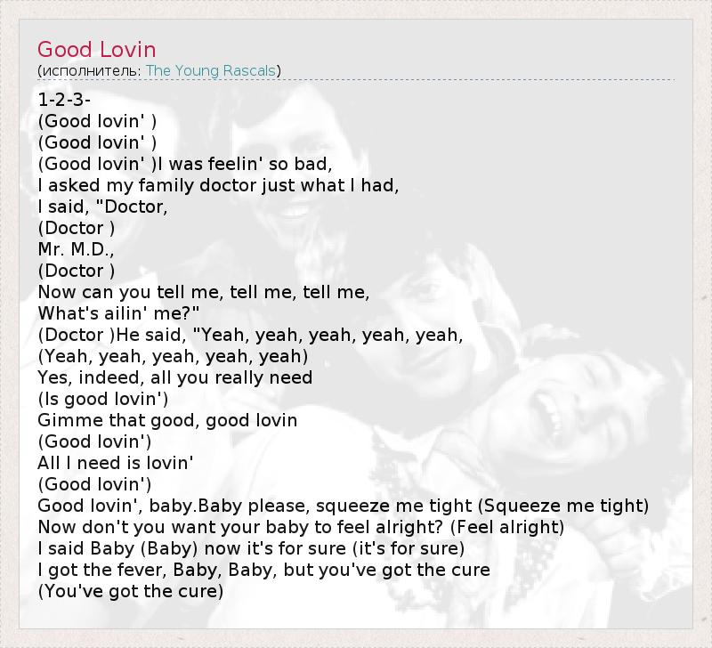 1-2-3- (Good lovin' ) (Good lovin' ) (Good lovin' )I was feelin' so bad, I asked my family doctor just what I had, I said, "Doctor, (Doctor ) Mr. M.D., (Doctor ) Now can you tell me, tell me, tell me, What's ailin' me?" (Doctor )He said, "Yeah, yeah, yeah, yeah, yeah, (Yeah, yeah, yeah, yeah, yeah) Yes, indeed, all you really need (Is good lovin') Gimme that good, good lovin (Good lovin') All I need is lovin' (Good lovin') Good lovin', baby.Baby please, squeeze me tight (Squeeze me tight) Now don't you want your baby to feel alright? (Feel alright) I said Baby (Baby) now it's for sure (it's for sure) I got the fever, Baby, Baby, but you've got the cure (You've got the cure)