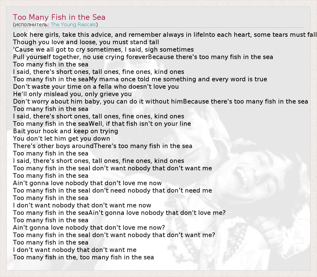 Look here girls, take this advice, and remember always in lifeInto each heart, some tears must fall Though you love and loose, you must stand tall 'Cause we all got to cry sometimes, I said, sigh sometimes Pull yourself together, no use crying foreverBecause there's too many fish in the sea Too many fish in the sea I said, there's short ones, tall ones, fine ones, kind ones Too many fish in the seaMy mama once told me something and every word is true Don't waste your time on a fella who doesn't love you He'll only mislead you, only grieve you Don't worry about him baby, you can do it without himBecause there's too many fish in the sea Too many fish in the sea I said, there's short ones, tall ones, fine ones, kind ones Too many fish in the seaWell, if that fish isn't on your line Bait your hook and keep on trying You don't let him get you down There's other boys aroundThere's too many fish in the sea Too many fish in the sea I said, there's short ones, tall ones, fine ones, kind ones Too many fish in the seaI don't want nobody that don't want me Too many fish in the sea Ain't gonna love nobody that don't love me now Too many fish in the seaI don't need nobody that don't need me Too many fish in the sea I don't want nobody that don't want me now Too many fish in the seaAin't gonna love nobody that don't love me? Too many fish in the sea Ain't gonna love nobody that don't love me now? Too many fish in the seaI don't want nobody that don't want me? Too many fish in the sea I don't want nobody that don't want me Too many fish in the, too many fish in the sea
