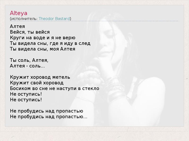Алтея Вейся, ты вейся Круги на воде и я не верю Ты видела сны, где я иду в след Ты видела сны, моя Алтея Ты соль, Алтея, Алтея - соль... Кружит хоровод метель Кружит свой хоровод Босиком во сне не наступи в стекло Не оступись! Не оступись! Не пробудись над пропастью Не пробудись над пропастью...