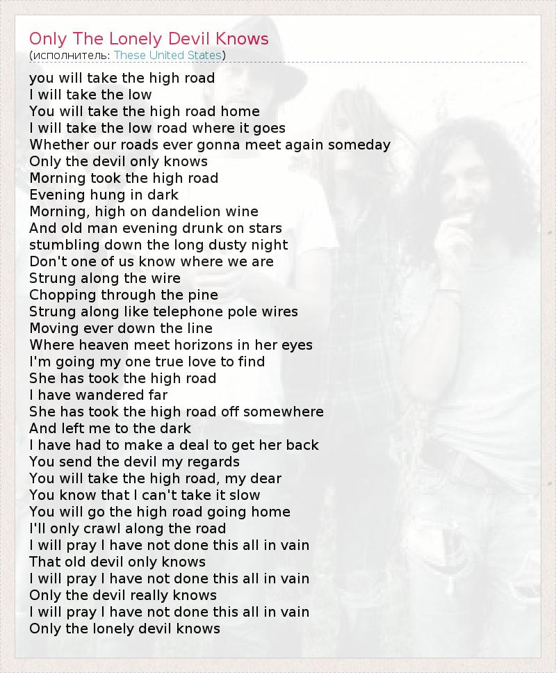 you will take the high road I will take the low You will take the high road home I will take the low road where it goes Whether our roads ever gonna meet again someday Only the devil only knows Morning took the high road Evening hung in dark Morning, high on dandelion wine And old man evening drunk on stars stumbling down the long dusty night Don't one of us know where we are Strung along the wire Chopping through the pine Strung along like telephone pole wires Moving ever down the line Where heaven meet horizons in her eyes I'm going my one true love to find She has took the high road I have wandered far She has took the high road off somewhere And left me to the dark I have had to make a deal to get her back You send the devil my regards You will take the high road, my dear You know that I can't take it slow You will go the high road going home I'll only crawl along the road I will pray I have not done this all in vain That old devil only knows I will pray I have not done this all in vain Only the devil really knows I will pray I have not done this all in vain Only the lonely devil knows