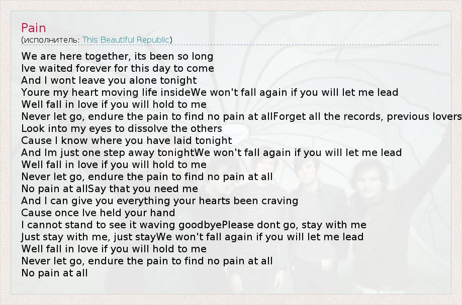 We are here together, its been so long Ive waited forever for this day to come And I wont leave you alone tonight Youre my heart moving life insideWe won't fall again if you will let me lead Well fall in love if you will hold to me Never let go, endure the pain to find no pain at allForget all the records, previous lovers Look into my eyes to dissolve the others Cause I know where you have laid tonight And Im just one step away tonightWe won't fall again if you will let me lead Well fall in love if you will hold to me Never let go, endure the pain to find no pain at all No pain at allSay that you need me And I can give you everything your hearts been craving Cause once Ive held your hand I cannot stand to see it waving goodbyePlease dont go, stay with me Just stay with me, just stayWe won't fall again if you will let me lead Well fall in love if you will hold to me Never let go, endure the pain to find no pain at all No pain at all