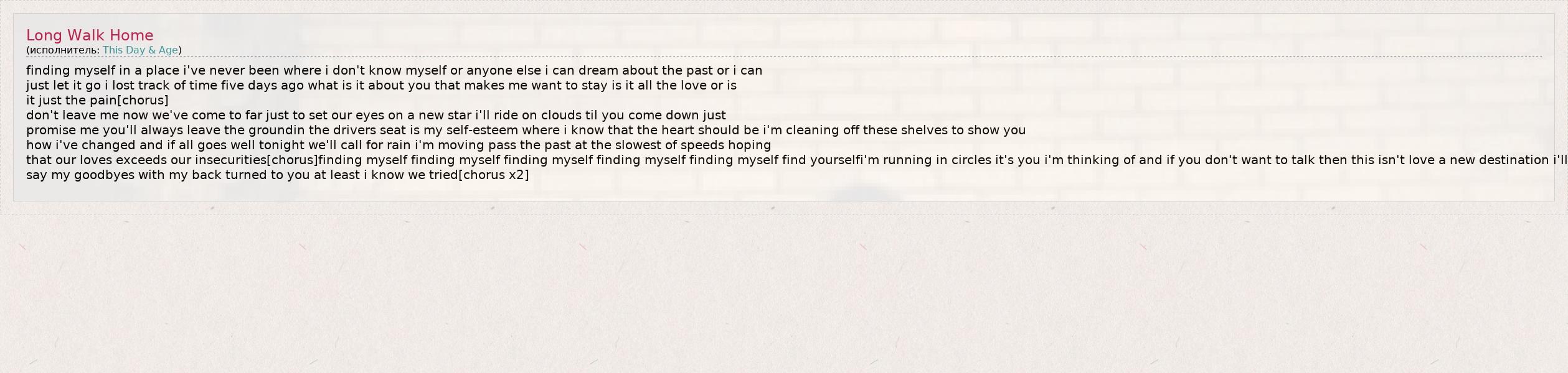 finding myself in a place i've never been where i don't know myself or anyone else i can dream about the past or i can just let it go i lost track of time five days ago what is it about you that makes me want to stay is it all the love or is it just the pain[chorus] don't leave me now we've come to far just to set our eyes on a new star i'll ride on clouds til you come down just promise me you'll always leave the groundin the drivers seat is my self-esteem where i know that the heart should be i'm cleaning off these shelves to show you how i've changed and if all goes well tonight we'll call for rain i'm moving pass the past at the slowest of speeds hoping that our loves exceeds our insecurities[chorus]finding myself finding myself finding myself finding myself finding myself find yourselfi'm running in circles it's you i'm thinking of and if you don't want to talk then this isn't love a new destination i'll say my goodbyes with my back turned to you at least i know we tried[chorus x2]