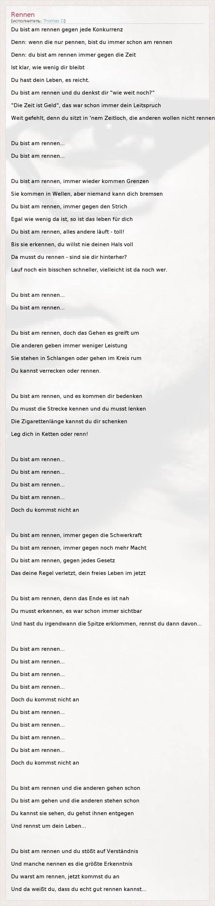 Du bist am rennen gegen jede Konkurrenz Denn: wenn die nur pennen, bist du immer schon am rennen Denn: du bist am rennen immer gegen die Zeit Ist klar, wie wenig dir bleibt Du hast dein Leben, es reicht. Du bist am rennen und du denkst dir "wie weit noch?" "Die Zeit ist Geld", das war schon immer dein Leitspruch Weit gefehlt, denn du sitzt in 'nem Zeitloch, die anderen wollen nicht rennen Du bist am rennen... Du bist am rennen... Du bist am rennen, immer wieder kommen Grenzen Sie kommen in Wellen, aber niemand kann dich bremsen Du bist am rennen, immer gegen den Strich Egal wie wenig da ist, so ist das leben für dich Du bist am rennen, alles andere läuft - toll! Bis sie erkennen, du willst nie deinen Hals voll Da musst du rennen - sind sie dir hinterher? Lauf noch ein bisschen schneller, vielleicht ist da noch wer. Du bist am rennen... Du bist am rennen... Du bist am rennen, doch das Gehen es greift um Die anderen geben immer weniger Leistung Sie stehen in Schlangen oder gehen im Kreis rum Du kannst verrecken oder rennen. Du bist am rennen, und es kommen dir bedenken Du musst die Strecke kennen und du musst lenken Die Zigarettenlänge kannst du dir schenken Leg dich in Ketten oder renn! Du bist am rennen... Du bist am rennen... Du bist am rennen... Du bist am rennen... Doch du kommst nicht an Du bist am rennen, immer gegen die Schwerkraft Du bist am rennen, immer gegen noch mehr Macht Du bist am rennen, gegen jedes Gesetz Das deine Regel verletzt, dein freies Leben im jetzt Du bist am rennen, denn das Ende es ist nah Du musst erkennen, es war schon immer sichtbar Und hast du irgendwann die Spitze erklommen, rennst du dann davon... Du bist am rennen... Du bist am rennen... Du bist am rennen... Du bist am rennen... Doch du kommst nicht an Du bist am rennen... Du bist am rennen... Du bist am rennen... Du bist am rennen... Doch du kommst nicht an Du bist am rennen und die anderen gehen schon Du bist am gehen und die anderen stehen schon Du kannst sie sehen, du gehst ihnen entgegen Und rennst um dein Leben... Du bist am rennen und du stößt auf Verständnis Und manche nennen es die größte Erkenntnis Du warst am rennen, jetzt kommst du an Und da weißt du, dass du echt gut rennen kannst...