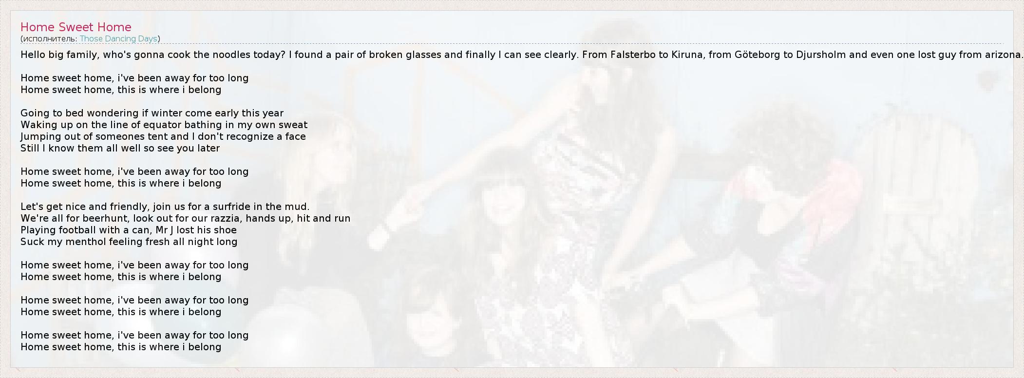 Привет большая семья, которая собирается готовить лапшу сегодня? Я нашел пару сломанных очках и, наконец, я могу видеть ясно. С Falsterbo в Кируна, от Гётеборга до Djursholm и даже один потерял парень из Аризоны. Дом, милый дом, я был далеко слишком долго Дом, милый дом, это, где я принадлежу Ложась спать интересно, если зима придет в начале этого года Проснувшись на линии экватора купания в моем собственном поту Выскочив из чьего-то палатке, и я не распознать лицо Тем не менее я их всех знаю хорошо, поэтому увидимся позже Дом, милый дом, я был далеко слишком долго Дом, милый дом, это, где я принадлежу Давайте хороший и дружелюбный, присоединяйтесь к нам на surfride в грязи. Мы все для beerhunt, обратите внимание на нашу Razzia, руки вверх, хит и запустить Игра в футбол с банкой, г-н J потерял ботинок Сосать мой ментола ощущение свежести всю ночь напролет Дом, милый дом, я был далеко слишком долго Дом, милый дом, это, где я принадлежу Дом, милый дом, я был далеко слишком долго Дом, милый дом, это, где я принадлежу Дом, милый дом, я был далеко слишком долго Дом, милый дом, это, где я принадлежу