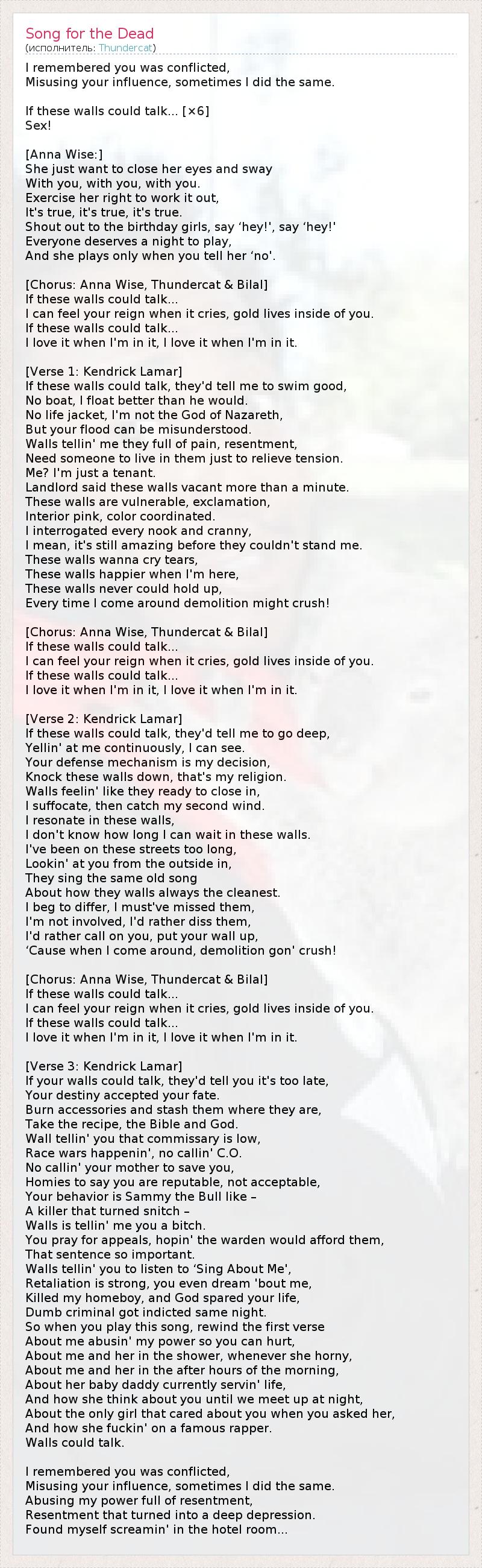 Помню, тебя раздирали противоречия, Ты злоупотребляла своим влиянием, порой я делал то же самое. Если бы эти стены могли говорить...[×6] Секс! [Anna Wise:] Она хочет закрывать глаза и уплывать С тобой, с тобой, с тобой. Воспользоваться своим правом на удовольствие, Это правда, правда, правда. Привет девушкам, отмечающим день рождения, скажите "Эгей!", скажите "Эгей!" Все заслуживают ночи забав, А она забавляется, только когда ты отказываешь ей. [Припев: Anna Wise, Thundercat и Bilal] Если бы эти стены могли говорить... Я ощущаю твою власть, когда сочится влага. В тебе лежит сокровище. Если бы эти стены могли говорить... Я люблю оказываться внутри, я люблю оказываться внутри. [Куплет 1: Kendrick Lamar] Если бы эти стены могли говорить, они велели бы мне искупаться всласть, Лодка не нужна, я плаваю лучше, чем он. Не нужен спасательный жилет, я не Господь-назарянин, Но твои воды могут истолковать неправильно. Стены говорят мне, что они полны боли и негодования, Кто-то должен жить внутри них, чтобы напряжение спало. Я? Я просто съёмщик. Хозяйка сказала, что стены пустуют уже давненько. Эти стены ранимы — вскрик! Розовый интерьер, цвет выдержан. Я опросил каждый укромный уголок и расселинку, Я к тому, что, пока они терпят меня, здесь по-прежнему великолепно. Эти стены хотят разразиться слезами, Эти стены становятся счастливее, когда я внутри, Эти стены никогда не умели сдерживаться, Каждый раз, едва я вхожу, может произойти обрушение! [Припев: Anna Wise, Thundercat и Bilal] Если бы эти стены могли говорить... Я ощущаю твою власть, когда сочится влага. В тебе лежит сокровище. Если бы эти стены могли говорить... Я люблю оказываться внутри, я люблю оказываться внутри. [Куплет 2: Kendrick Lamar] Если бы эти стены могли говорить, они велели бы мне заглянуть глубже, Они беспрестанно кричат на меня, понимаю. Механизм твоей защиты — решение, принятое мной, Долбить эти стены — моя религия. Стены чувствуют, что вот-вот сомкнутся, Я задыхаюсь, а после открывается второе дыхание. Я резонирую в этих стенах, Не знаю, сколько я могу прождать в этих стенах. Я слишком долго пробыл на этих улицах, Глядя на тебя снаружи, Они заводят старую песню О том, что эти стены самые непорочные. Я молю о разнообразии, должно быть, я упустил их из виду, Я не был втянут сюда, я бы лучше осквернил их, Я бы лучше обратился к вам, воздвиг бы ваши стены, Ведь каждый раз, едва я вхожу, происходит обрушение! [Припев: Anna Wise, Thundercat и Bilal] Если бы эти стены могли говорить... Я ощущаю твою власть, когда сочится влага. В тебе лежит сокровище. Если бы эти стены могли говорить... Я люблю оказываться внутри, я люблю оказываться внутри. [Куплет 3: Kendrick Lamar] Если бы эти стены могли говорить, они сказали бы тебе, что уже слишком поздно: Твоя душа смирилась с неизбежностью. Сожги все свои приспособления и спрячь туда, где им место, Вот тебе рецепт — Библия и Бог. Стена говорит, что твой склад пуст, Идут расовые войны, не зови своего надзирателя, Не звони матери, чтоб она спасла тебя, Братишки говорят, что ты заслуживаешь уважение, такое неприемлемо, Ты ведёшь себя как Сэмми Бык — Убийца, ставший стукачом, 1 Стены подсказывают мне, что ты с**ка. Ты молишь о прошениях, надеясь, что начальник даст им ход, Приговор имеет слишком большое значение. Стены подсказывают тебе послушать "Спойте обо мне", 2 Возмездие сурово, я даже снюсь тебе, Ты убил моего другана, и бог разделил твою жизнь, Безмозглому уг