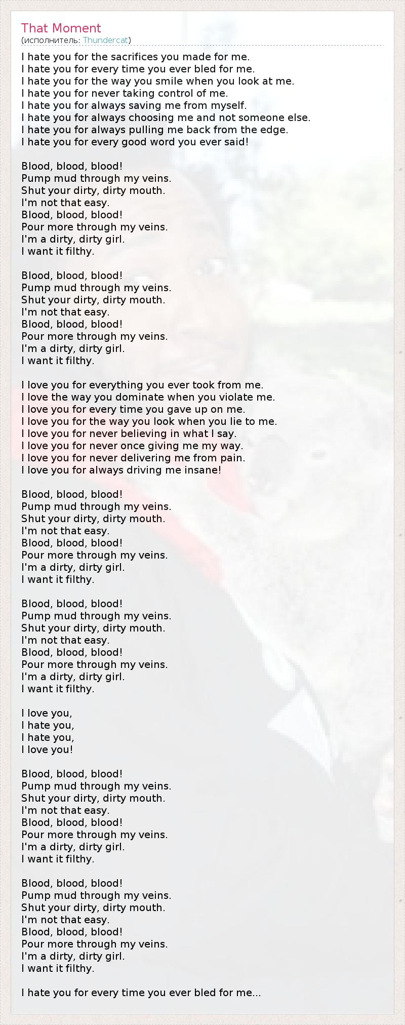 Я ненавижу тебя за все жертвы, на которые ты шел ради меня. Я ненавижу тебя за каждый раз, когда ты истекал кровью ради меня. Я ненавижу тебя за то, как ты улыбаешься, глядя на меня. Я ненавижу тебя за то, что ты никогда не контролируешь меня. Я ненавижу тебя за то, что ты всегда спасаешь меня от самой себя. Я ненавижу тебя за то, что ты всегда выбираешь меня, а не кого-то другого. Я ненавижу тебя за то, что ты всегда уводишь меня с края пропасти. Я ненавижу тебя за каждое сказанное тобой доброе слово! Кровь, кровь, кровь! Грязь течет в моих венах. Закрой свой грязный, грязный рот. Я не так проста. Кровь, кровь, кровь! Течет сильнее в моих венах. Я грязная, грязная девчонка, Я хочу разврата. Кровь, кровь, кровь! Грязь течет в моих венах. Закрой свой грязный, грязный рот. Я не так проста. Кровь, кровь, кровь! Течет сильнее в моих венах. Я грязная, грязная девчонка, Я хочу разврата. Я люблю тебя за всё, что ты когда-либо отнимал у меня. Мне нравится, как ты подавляешь меня, когда насилуешь. Я люблю тебя за каждый раз, когда ты бросал меня. Мне нравится, как ты выглядишь, когда лжёшь мне. Я люблю тебя за то, что ты никогда не верил в мои слова. Я люблю тебя за то, что ты никогда не даешь мне идти своей дорогой. Я люблю тебя за то, что ты никогда не оберегаешь меня от боли. Я люблю тебя за то, что ты всегда сводишь меня с ума! Кровь, кровь, кровь! Грязь течет в моих венах. Закрой свой грязный, грязный рот. Я не так проста. Кровь, кровь, кровь! Течет сильнее в моих венах. Я грязная, грязная девчонка, Я хочу разврата. Кровь, кровь, кровь! Грязь течет в моих венах. Закрой свой грязный, грязный рот. Я не так проста. Кровь, кровь, кровь! Течет сильнее в моих венах. Я грязная, грязная девчонка, Я хочу разврата. Я люблю тебя, Я ненавижу тебя, Я ненавижу тебя, Я люблю тебя! Кровь, кровь, кровь! Грязь течет в моих венах. Закрой свой грязный, грязный рот. Я не так проста. Кровь, кровь, кровь! Течет сильнее в моих венах. Я грязная, грязная девчонка, Я хочу разврата. Кровь, кровь, кровь! Грязь течет в моих венах. Закрой свой грязный, грязный рот. Я не так проста. Кровь, кровь, кровь! Течет сильнее в моих венах. Я грязная, грязная девчонка, Я хочу разврата. Я ненавижу тебя за каждый раз, когда ты истекал кровью ради меня...