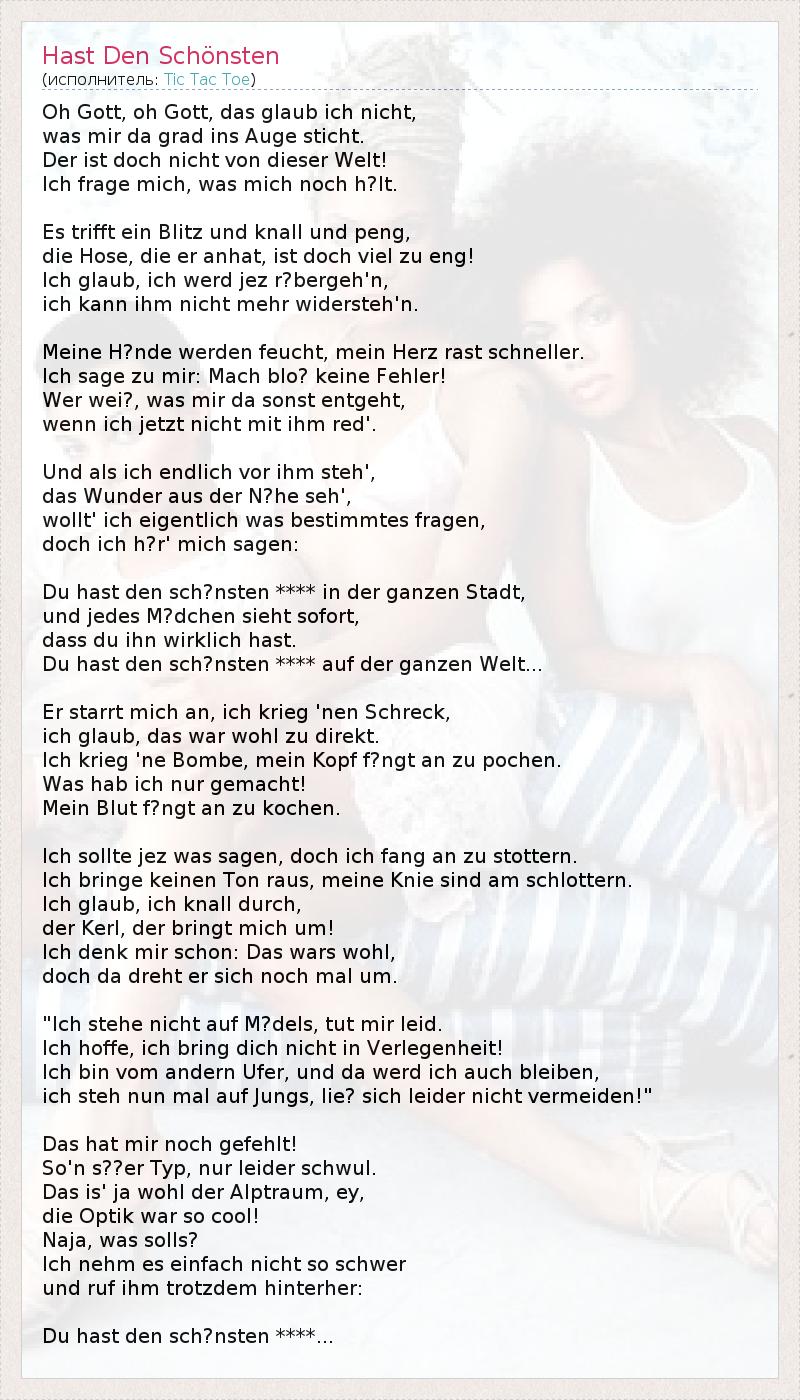 Oh Gott, oh Gott, das glaub ich nicht, was mir da grad ins Auge sticht. Der ist doch nicht von dieser Welt! Ich frage mich, was mich noch h?lt. Es trifft ein Blitz und knall und peng, die Hose, die er anhat, ist doch viel zu eng! Ich glaub, ich werd jez r?bergeh'n, ich kann ihm nicht mehr widersteh'n. Meine H?nde werden feucht, mein Herz rast schneller. Ich sage zu mir: Mach blo? keine Fehler! Wer wei?, was mir da sonst entgeht, wenn ich jetzt nicht mit ihm red'. Und als ich endlich vor ihm steh', das Wunder aus der N?he seh', wollt' ich eigentlich was bestimmtes fragen, doch ich h?r' mich sagen: Du hast den sch?nsten **** in der ganzen Stadt, und jedes M?dchen sieht sofort, dass du ihn wirklich hast. Du hast den sch?nsten **** auf der ganzen Welt... Er starrt mich an, ich krieg 'nen Schreck, ich glaub, das war wohl zu direkt. Ich krieg 'ne Bombe, mein Kopf f?ngt an zu pochen. Was hab ich nur gemacht! Mein Blut f?ngt an zu kochen. Ich sollte jez was sagen, doch ich fang an zu stottern. Ich bringe keinen Ton raus, meine Knie sind am schlottern. Ich glaub, ich knall durch, der Kerl, der bringt mich um! Ich denk mir schon: Das wars wohl, doch da dreht er sich noch mal um. "Ich stehe nicht auf M?dels, tut mir leid. Ich hoffe, ich bring dich nicht in Verlegenheit! Ich bin vom andern Ufer, und da werd ich auch bleiben, ich steh nun mal auf Jungs, lie? sich leider nicht vermeiden!" Das hat mir noch gefehlt! So'n s??er Typ, nur leider schwul. Das is' ja wohl der Alptraum, ey, die Optik war so cool! Naja, was solls? Ich nehm es einfach nicht so schwer und ruf ihm trotzdem hinterher: Du hast den sch?nsten ****...