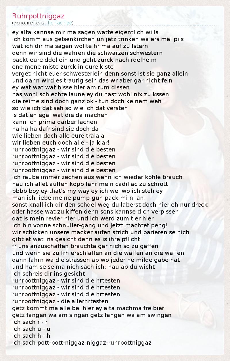 ey alta kannse mir ma sagen watte eigentlich wills ich komm aus gelsenkirchen un jetz trinken wa ers mal pils wat ich dir ma sagen wollte hr ma auf zu lstern denn wir sind die wahren die schwarzen schwestern packt eure ddel ein und geht zurck nach rdelheim ene mene miste zurck in eure kiste verget nicht euer schwesterlein denn sonst ist sie ganz allein und dann wird es traurig sein das wr aber gar nicht fein ey wat wat wat bisse hier am rum dissen has wohl schlechte laune ey du hast wohl nix zu kssen die reime sind doch ganz ok - tun doch keinem weh so wie ich dat seh so wie ich dat versteh is dat eh egal wat die da machen kann ich prima darber lachen ha ha ha dafr sind sie doch da wie lieben doch alle eure tralala wir lieben euch doch alle - ja klar! ruhrpottniggaz - wir sind die besten ruhrpottniggaz - wir sind die besten ruhrpottniggaz - wir sind die besten ruhrpottniggaz - wir sind die besten ich raube immer zechen aus wenn ich wieder kohle brauch hau ich allet auffen kopp fahr mein cadillac zu schrott bbbb boy ey that's my way ey ich wei wo ich steh ey man ich liebe meine pump-gun pack mi ni an sonst knall ich dir den schdel weg du laberst doch hier eh nur dreck oder hasse wat zu kiffen denn sons kannse dich verpissen dat is mein revier hier und ich werd zum tier hier ich bin vonne schnuller-gang und jetzt machtet peng! wir schicken unsere macker aufen strich und parieren se nich gibt et wat ins gesicht denn es is ihre pflicht fr uns anzuschaffen brauchta gar nich so zu gaffen und wenn sie zu frh erschlaffen an die waffen an die waffen dann fahrn wa die strassen ab wo jeder ne milde gabe hat und ham se se ma nich sach ich: hau ab du wicht ich schreis dir ins gesicht ruhrpottniggaz - wir sind die hrtesten ruhrpottniggaz - wir sind die hrtesten ruhrpottniggaz - wir sind die hrtesten ruhrpottniggaz - die allerhrtesten getz kommt ma alle bei hier ey alta machma freibier getz fangen wa am singen getz fangen wa am swingen ich sach r - r ich sach u - u ich sach h - h ich sach pott-pott-niggaz-niggaz-ruhrpottniggaz