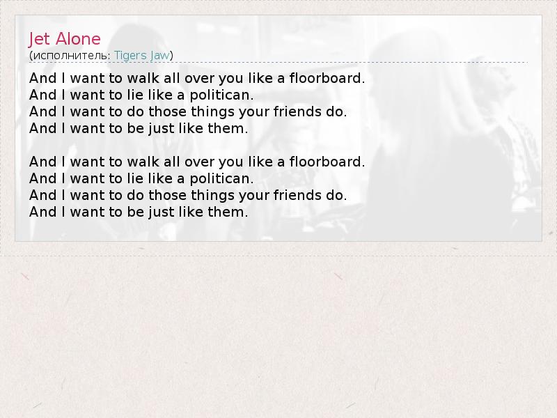 And I want to walk all over you like a floorboard. And I want to lie like a politican. And I want to do those things your friends do. And I want to be just like them. And I want to walk all over you like a floorboard. And I want to lie like a politican. And I want to do those things your friends do. And I want to be just like them.
