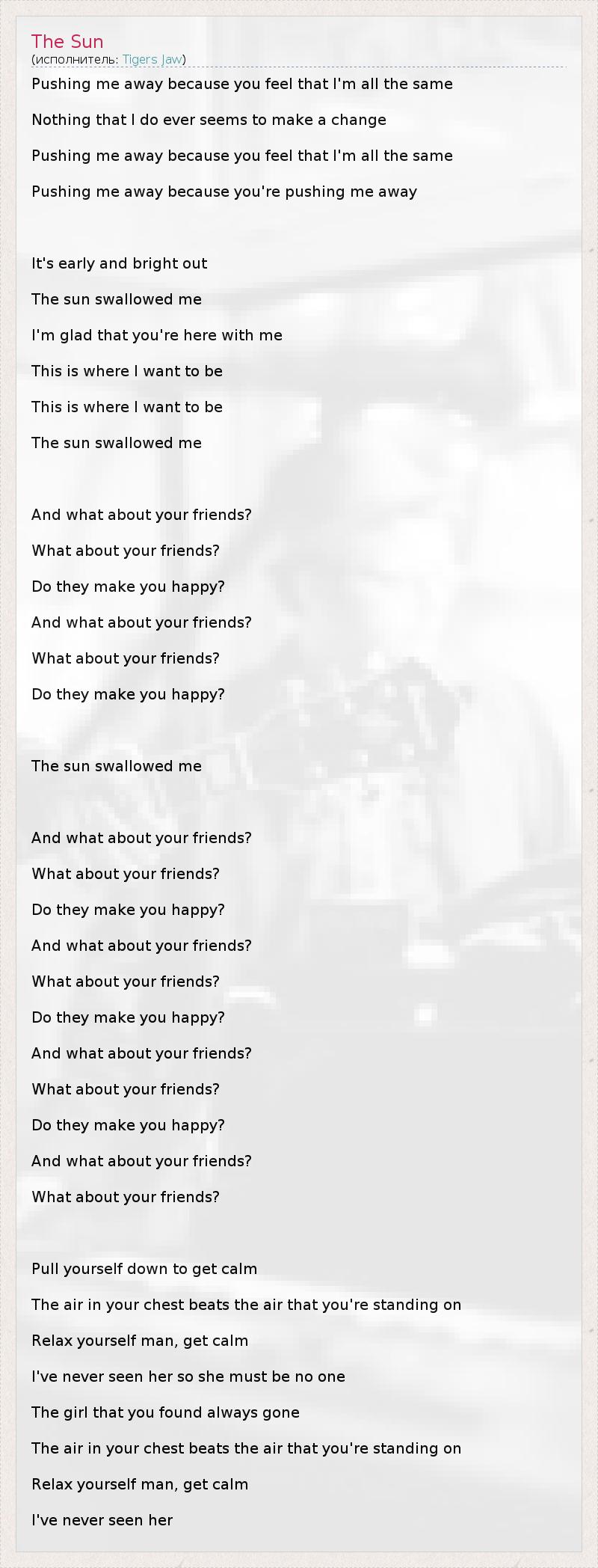 Pushing me away because you feel that I'm all the same Nothing that I do ever seems to make a change Pushing me away because you feel that I'm all the same Pushing me away because you're pushing me away It's early and bright out The sun swallowed me I'm glad that you're here with me This is where I want to be This is where I want to be The sun swallowed me And what about your friends? What about your friends? Do they make you happy? And what about your friends? What about your friends? Do they make you happy? The sun swallowed me And what about your friends? What about your friends? Do they make you happy? And what about your friends? What about your friends? Do they make you happy? And what about your friends? What about your friends? Do they make you happy? And what about your friends? What about your friends? Pull yourself down to get calm The air in your chest beats the air that you're standing on Relax yourself man, get calm I've never seen her so she must be no one The girl that you found always gone The air in your chest beats the air that you're standing on Relax yourself man, get calm I've never seen her