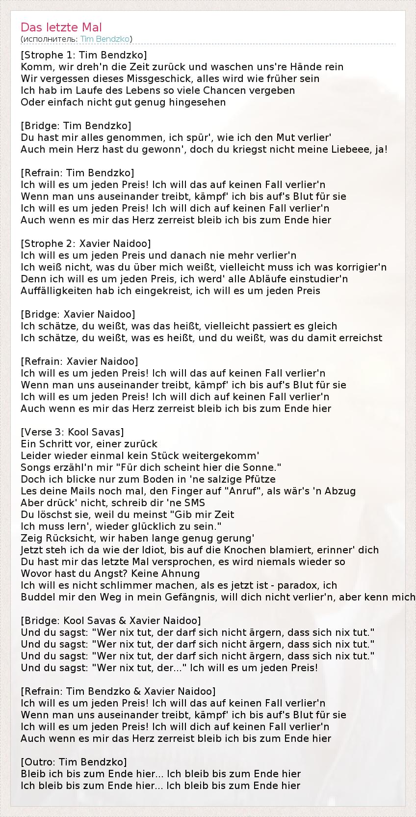 [Strophe 1: Tim Bendzko] Komm, wir dreh'n die Zeit zurück und waschen uns're Hände rein Wir vergessen dieses Missgeschick, alles wird wie früher sein Ich hab im Laufe des Lebens so viele Chancen vergeben Oder einfach nicht gut genug hingesehen [Bridge: Tim Bendzko] Du hast mir alles genommen, ich spür', wie ich den Mut verlier' Auch mein Herz hast du gewonn', doch du kriegst nicht meine Liebeee, ja! [Refrain: Tim Bendzko] Ich will es um jeden Preis! Ich will das auf keinen Fall verlier'n Wenn man uns auseinander treibt, kämpf' ich bis auf's Blut für sie Ich will es um jeden Preis! Ich will dich auf keinen Fall verlier'n Auch wenn es mir das Herz zerreist bleib ich bis zum Ende hier [Strophe 2: Xavier Naidoo] Ich will es um jeden Preis und danach nie mehr verlier'n Ich weiß nicht, was du über mich weißt, vielleicht muss ich was korrigier'n Denn ich will es um jeden Preis, ich werd' alle Abläufe einstudier'n Auffälligkeiten hab ich eingekreist, ich will es um jeden Preis [Bridge: Xavier Naidoo] Ich schätze, du weißt, was das heißt, vielleicht passiert es gleich Ich schätze, du weißt, was es heißt, und du weißt, was du damit erreichst [Refrain: Xavier Naidoo] Ich will es um jeden Preis! Ich will das auf keinen Fall verlier'n Wenn man uns auseinander treibt, kämpf' ich bis auf's Blut für sie Ich will es um jeden Preis! Ich will dich auf keinen Fall verlier'n Auch wenn es mir das Herz zerreist bleib ich bis zum Ende hier [Verse 3: Kool Savas] Ein Schritt vor, einer zurück Leider wieder einmal kein Stück weitergekomm' Songs erzähl'n mir "Für dich scheint hier die Sonne." Doch ich blicke nur zum Boden in 'ne salzige Pfütze Les deine Mails noch mal, den Finger auf "Anruf", als wär's 'n Abzug Aber drück' nicht, schreib dir 'ne SMS Du löschst sie, weil du meinst "Gib mir Zeit Ich muss lern', wieder glücklich zu sein." Zeig Rücksicht, wir haben lange genug gerung' Jetzt steh ich da wie der Idiot, bis auf die Knochen blamiert, erinner' dich Du hast mir das letzte Mal versprochen, es wird niemals wieder so Wovor hast du Angst? Keine Ahnung Ich will es nicht schlimmer machen, als es jetzt ist - paradox, ich Buddel mir den Weg in mein Gefängnis, will dich nicht verlier'n, aber kenn mich [Bridge: Kool Savas & Xavier Naidoo] Und du sagst: "Wer nix tut, der darf sich nicht ärgern, dass sich nix tut." Und du sagst: "Wer nix tut, der darf sich nicht ärgern, dass sich nix tut." Und du sagst: "Wer nix tut, der darf sich nicht ärgern, dass sich nix tut." Und du sagst: "Wer nix tut, der..." Ich will es um jeden Preis! [Refrain: Tim Bendzko & Xavier Naidoo] Ich will es um jeden Preis! Ich will das auf keinen Fall verlier'n Wenn man uns auseinander treibt, kämpf' ich bis auf's Blut für sie Ich will es um jeden Preis! Ich will dich auf keinen Fall verlier'n Auch wenn es mir das Herz zerreist bleib ich bis zum Ende hier [Outro: Tim Bendzko] Bleib ich bis zum Ende hier... Ich bleib bis zum Ende hier Ich bleib bis zum Ende hier... Ich bleib bis zum Ende hier