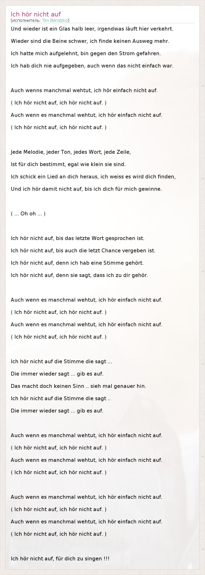 Und wieder ist ein Glas halb leer, irgendwas läuft hier verkehrt. Wieder sind die Beine schwer, ich finde keinen Ausweg mehr. Ich hatte mich aufgelehnt, bin gegen den Strom gefahren. Ich hab dich nie aufgegeben, auch wenn das nicht einfach war. Auch wenns manchmal wehtut, ich hör einfach nicht auf. ( Ich hör nicht auf, ich hör nicht auf. ) Auch wenn es manchmal wehtut, ich hör einfach nicht auf. ( Ich hör nicht auf, ich hör nicht auf. ) Jede Melodie, jeder Ton, jedes Wort, jede Zeile, Ist für dich bestimmt, egal wie klein sie sind. Ich schick ein Lied an dich heraus, ich weiss es wird dich finden, Und ich hör damit nicht auf, bis ich dich für mich gewinne. ( ... Oh oh ... ) Ich hör nicht auf, bis das letzte Wort gesprochen ist. Ich hör nicht auf, bis auch die letzt Chance vergeben ist. Ich hör nicht auf, denn ich hab eine Stimme gehört. Ich hör nicht auf, denn sie sagt, dass ich zu dir gehör. Auch wenn es manchmal wehtut, ich hör einfach nicht auf. ( Ich hör nicht auf, ich hör nicht auf. ) Auch wenn es manchmal wehtut, ich hör einfach nicht auf. ( Ich hör nicht auf, ich hör nicht auf. ) Ich hör nicht auf die Stimme die sagt ... Die immer wieder sagt ... gib es auf. Das macht doch keinen Sinn .. sieh mal genauer hin. Ich hör nicht auf die Stimme die sagt .. Die immer wieder sagt ... gib es auf. Auch wenn es manchmal wehtut, ich hör einfach nicht auf. ( Ich hör nicht auf, ich hör nicht auf. ) Auch wenn es manchmal wehtut, ich hör einfach nicht auf. ( Ich hör nicht auf, ich hör nicht auf. ) Auch wenn es manchmal wehtut, ich hör einfach nicht auf. ( Ich hör nicht auf, ich hör nicht auf. ) Auch wenn es manchmal wehtut, ich hör einfach nicht auf. ( Ich hör nicht auf, ich hör nicht auf. ) Ich hör nicht auf, für dich zu singen !!!