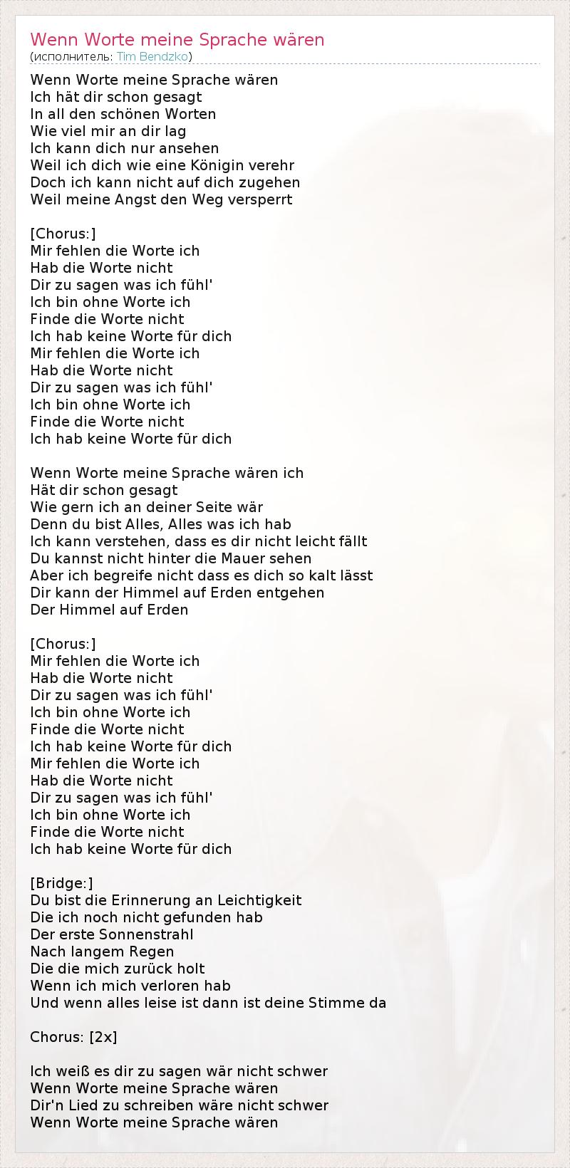 Wenn Worte meine Sprache wären Ich hät dir schon gesagt In all den schönen Worten Wie viel mir an dir lag Ich kann dich nur ansehen Weil ich dich wie eine Königin verehr Doch ich kann nicht auf dich zugehen Weil meine Angst den Weg versperrt [Chorus:] Mir fehlen die Worte ich Hab die Worte nicht Dir zu sagen was ich fühl' Ich bin ohne Worte ich Finde die Worte nicht Ich hab keine Worte für dich Mir fehlen die Worte ich Hab die Worte nicht Dir zu sagen was ich fühl' Ich bin ohne Worte ich Finde die Worte nicht Ich hab keine Worte für dich Wenn Worte meine Sprache wären ich Hät dir schon gesagt Wie gern ich an deiner Seite wär Denn du bist Alles, Alles was ich hab Ich kann verstehen, dass es dir nicht leicht fällt Du kannst nicht hinter die Mauer sehen Aber ich begreife nicht dass es dich so kalt lässt Dir kann der Himmel auf Erden entgehen Der Himmel auf Erden [Chorus:] Mir fehlen die Worte ich Hab die Worte nicht Dir zu sagen was ich fühl' Ich bin ohne Worte ich Finde die Worte nicht Ich hab keine Worte für dich Mir fehlen die Worte ich Hab die Worte nicht Dir zu sagen was ich fühl' Ich bin ohne Worte ich Finde die Worte nicht Ich hab keine Worte für dich [Bridge:] Du bist die Erinnerung an Leichtigkeit Die ich noch nicht gefunden hab Der erste Sonnenstrahl Nach langem Regen Die die mich zurück holt Wenn ich mich verloren hab Und wenn alles leise ist dann ist deine Stimme da Chorus: [2x] Ich weiß es dir zu sagen wär nicht schwer Wenn Worte meine Sprache wären Dir'n Lied zu schreiben wäre nicht schwer Wenn Worte meine Sprache wären