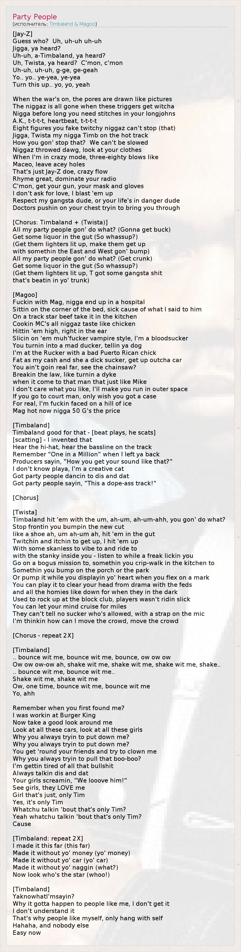 [Jay-Z] Guess who? Uh, uh-uh uh-uh Jigga, ya heard? Uh-uh, a-Timbaland, ya heard? Uh, Twista, ya heard? C'mon, c'mon Uh-uh, uh-uh, g-ge, ge-geah Yo.. yo.. ye-yea, ye-yea Turn this up.. yo, yo, yeah When the war's on, the pores are drawn like pictures The niggaz is all gone when these triggers get witcha Nigga before long you need stitches in your longjohns A.K., t-t-t-t, heartbeat, t-t-t-t Eight figures you fake twitchy niggaz can't stop (that) Jigga, Twista my nigga Timb on the hot track How you gon' stop that? We can't be slowed Niggaz throwed dawg, look at your clothes When I'm in crazy mode, three-eighty blows like Maceo, leave acey holes That's just Jay-Z doe, crazy flow Rhyme great, dominate your radio C'mon, get your gun, your mask and gloves I don't ask for love, I blast 'em up Respect my gangsta dude, or your life's in danger dude Doctors pushin on your chest tryin to bring you through [Chorus: Timbaland + (Twista)] All my party people gon' do what? (Gonna get buck) Get some liquor in the gut (So whassup?) (Get them lighters lit up, make them get up with somethin the East and West gon' bump) All my party people gon' do what? (Get crunk) Get some liquor in the gut (So whassup?) (Get them lighters lit up, T got some gangsta shit that's beatin in yo' trunk) [Magoo] Fuckin with Mag, nigga end up in a hospital Sittin on the corner of the bed, sick cause of what I said to him On a track star beef take it in the kitchen Cookin MC's all niggaz taste like chicken Hittin 'em high, right in the ear Slicin on 'em muh'fucker vampire style, I'm a bloodsucker You turnin into a mad ducker, tellin ya dog I'm at the Rucker with a bad Puerto Rican chick Fat as my cash and she a dick sucker, get up outcha car You ain't goin real far, see the chainsaw? Breakin the law, like turnin a dyke when it come to that man that just like Mike I don't care what you like, I'll make you run in outer space If you go to court man, only wish you got a case For real, I'm fuckin faced on a hill of ice Mag hot now nigga 50 G's the price [Timbaland] Timbaland good for that - [beat plays, he scats] [scatting] - I invented that Hear the hi-hat, hear the bassline on the track Remember "One in a Million" when I left ya back Producers sayin, "How you get your sound like that?" I don't know playa, I'm a creative cat Got party people dancin to dis and dat Got party people sayin, "This a dope-ass track!" [Chorus] [Twista] Timbaland hit 'em with the um, ah-um, ah-um-ahh, you gon' do what? Stop frontin you bumpin the new cut like a shoe ah, um ah-um ah, hit 'em in the gut Twitchin and itchin to get up, I hit 'em up With some skanless to vibe to and ride to with the stanky inside you - listen to while a freak lickin you Go on a bogus mission to, somethin you crip-walk in the kitchen to Somethin you bump on the porch or the park Or pump it while you displayin yo' heart when you flex on a mark You can play it to clear your head from drama with the feds and all the homies like down for when they in the dark Used to rock up at the block club, players wasn't ridin slick You can let your mind cruise for miles They can't tell no sucker who's allowed, with a strap on the mic I'm thinkin how can I move the crowd, move the crowd [Chorus - repeat 2X] [Timbaland] .. bounce wit me, bounce wit me, bounce, ow ow ow Ow ow ow-ow ah, shake wit me, shake wit me, shake wit me, shake.. .. bounce wit me, bounce wit me.. Shake wit me, shake wit me Ow, one time, bounce wit me, bounce wit me Yo, ahh Remember when you first found me? I was workin at Burger King Now take a good look around me Look at all these cars, look at all these girls Why you always tryin to put down me? Why you always tryin to put down me? You get 'round your friends and try to clown me Why you always tryin to pull that boo-boo? I'm gettin tired of all that bullshit Always talkin dis and dat Your girls screamin, "We looove him!" See girls, they LOVE me Girl that's just, only Tim Yes, it's only Tim Whatchu talkin 'bout that's only Tim? Yeah whatchu talkin 'bout that's only Tim? Cause [Timbaland: repeat 2X] I made it this far (this far) Made it without yo' money (yo' money) Made it without yo' car (yo' car) Made it without yo' naggin (what?) Now look who's the star (whoo!) [Timbaland] YaknowhatI'msayin? Why it gotta happen to people like me, I don't get it I don't understand it That's why people like myself, only hang with self Hahaha, and nobody else Easy now