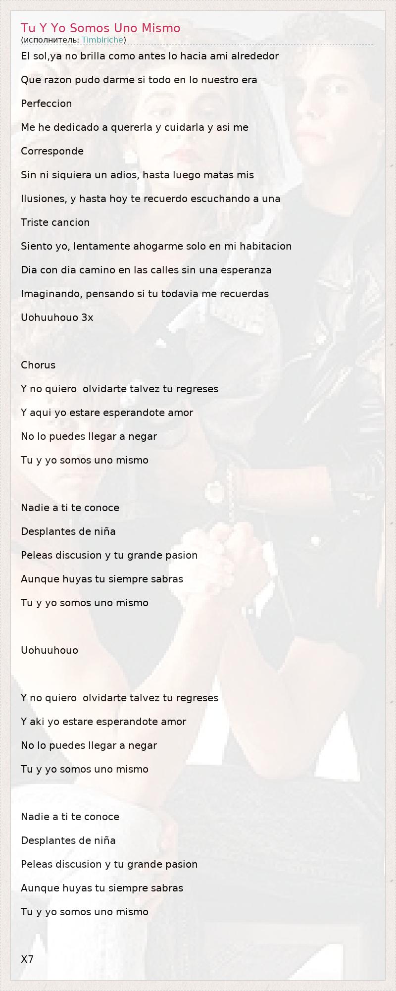 ГлавнаяИсполнителиTimbiricheTu Y Yo Somos Uno Mismo