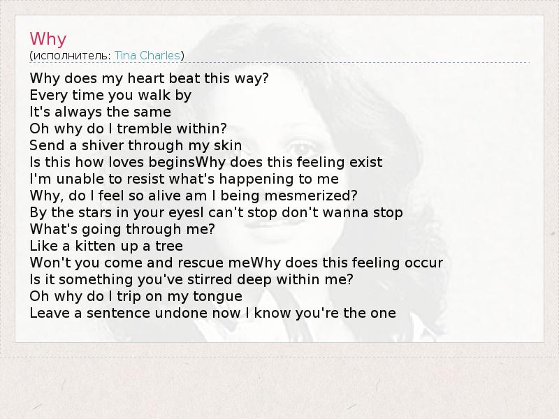 Why does my heart beat this way? Every time you walk by It's always the same Oh why do I tremble within? Send a shiver through my skin Is this how loves beginsWhy does this feeling exist I'm unable to resist what's happening to me Why, do I feel so alive am I being mesmerized? By the stars in your eyesI can't stop don't wanna stop What's going through me? Like a kitten up a tree Won't you come and rescue meWhy does this feeling occur Is it something you've stirred deep within me? Oh why do I trip on my tongue Leave a sentence undone now I know you're the one