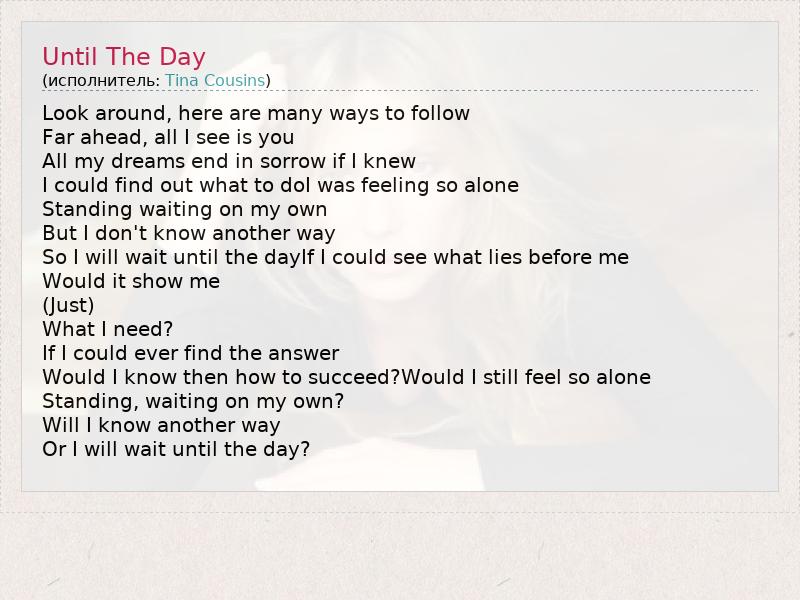 Look around, here are many ways to follow Far ahead, all I see is you All my dreams end in sorrow if I knew I could find out what to doI was feeling so alone Standing waiting on my own But I don't know another way So I will wait until the dayIf I could see what lies before me Would it show me (Just) What I need? If I could ever find the answer Would I know then how to succeed?Would I still feel so alone Standing, waiting on my own? Will I know another way Or I will wait until the day?