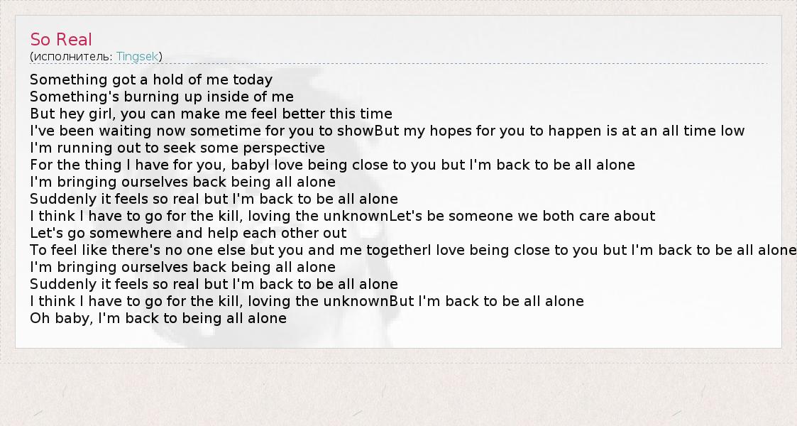 Something got a hold of me today Something's burning up inside of me But hey girl, you can make me feel better this time I've been waiting now sometime for you to showBut my hopes for you to happen is at an all time low I'm running out to seek some perspective For the thing I have for you, babyI love being close to you but I'm back to be all alone I'm bringing ourselves back being all alone Suddenly it feels so real but I'm back to be all alone I think I have to go for the kill, loving the unknownLet's be someone we both care about Let's go somewhere and help each other out To feel like there's no one else but you and me togetherI love being close to you but I'm back to be all alone I'm bringing ourselves back being all alone Suddenly it feels so real but I'm back to be all alone I think I have to go for the kill, loving the unknownBut I'm back to be all alone Oh baby, I'm back to being all alone