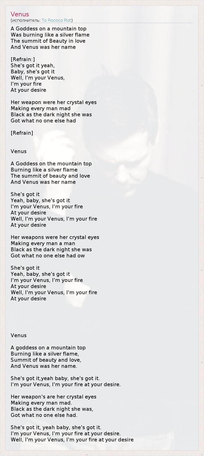 A Goddess on a mountain top Was burning like a silver flame The summit of Beauty in love And Venus was her name [Refrain:] She's got it yeah, Baby, she's got it Well, I'm your Venus, I'm your fire At your desire Her weapon were her crystal eyes Making every man mad Black as the dark night she was Got what no one else had [Refrain] Venus A Goddess on the mountain top Burning like a silver flame The summit of beauty and love And Venus was her name She's got it Yeah, baby, she's got it I'm your Venus, I'm your fire At your desire Well, I'm your Venus, I'm your fire At your desire Her weapons were her crystal eyes Making every man a man Black as the dark night she was Got what no one else had ow She's got it Yeah, baby, she's got it I'm your Venus, I'm your fire At your desire Well, I'm your Venus, I'm your fire At your desire Venus A goddess on a mountain top Burning like a silver flame, Summit of beauty and love, And Venus was her name. She's got it,yeah baby, she's got it. I'm your Venus, I'm your fire at your desire. Her weapon's are her crystal eyes Making every man mad. Black as the dark night she was, Got what no one else had. She's got it, yeah baby, she's got it. I'm your Venus, I'm your fire at your desire. Well, I'm your Venus, I'm your fire at your desire