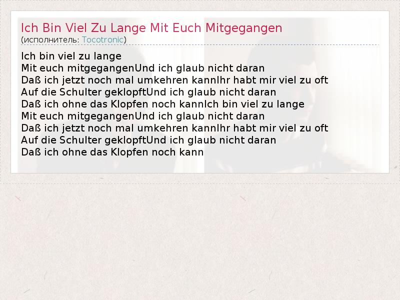 А как ты думаешь, о чем песня "Ich Bin Viel Zu Lange Mit Euch Mitgegangen" ?