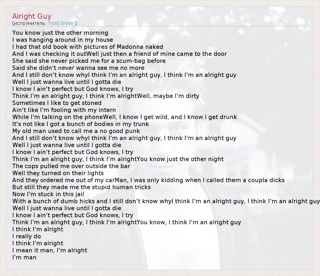 You know just the other morning I was hanging around in my house I had that old book with pictures of Madonna naked And I was checking it outWell just then a friend of mine came to the door She said she never picked me for a scum-bag before Said she didn't never wanna see me no more And I still don't know whyI think I'm an alright guy, I think I'm an alright guy Well I just wanna live until I gotta die I know I ain't perfect but God knows, I try Think I'm an alright guy, I think I'm alrightWell, maybe I'm dirty Sometimes I like to get stoned Ain't like I'm fooling with my intern While I'm talking on the phoneWell, I know I get wild, and I know I get drunk It's not like I got a bunch of bodies in my trunk My old man used to call me a no good punk And I still don't know whyI think I'm an alright guy, I think I'm an alright guy Well I just wanna live until I gotta die I know I ain't perfect but God knows, I try Think I'm an alright guy, I think I'm alrightYou know just the other night The cops pulled me over outside the bar Well they turned on their lights And they ordered me out of my carMan, I was only kidding when I called them a coupla dicks But still they made me the stupid human tricks Now I'm stuck in this jail With a bunch of dumb hicks and I still don't know whyI think I'm an alright guy, I think I'm an alright guy Well I just wanna live until I gotta die I know I ain't perfect but God knows, I try Think I'm an alright guy, I think I'm alrightYou know, I think I'm an alright guy I think I'm alright I really do I think I'm alright I mean it man, I'm alright I'm man