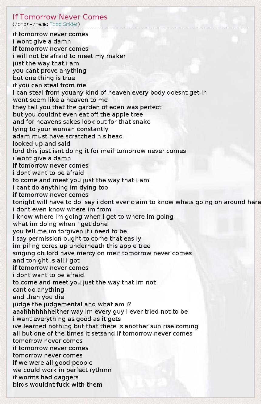 if tomorrow never comes i wont give a damn if tomorrow never comes i will not be afraid to meet my maker just the way that i am you cant prove anything but one thing is true if you can steal from me i can steal from youany kind of heaven every body doesnt get in wont seem like a heaven to me they tell you that the garden of eden was perfect but you couldnt even eat off the apple tree and for heavens sakes look out for that snake lying to your woman constantly adam must have scratched his head looked up and said lord this just isnt doing it for meif tomorrow never comes i wont give a damn if tomorrow never comes i dont want to be afraid to come and meet you just the way that i am i cant do anything im dying too if tomorrow never comes tonight will have to doi say i dont ever claim to know whats going on around here i dont even know where im from i know where im going when i get to where im going what im doing when i get done you tell me im forgiven if i need to be i say permission ought to come that easily im piling cores up underneath this apple tree singing oh lord have mercy on meif tomorrow never comes and tonight is all i got if tomorrow never comes i dont want to be afraid to come and meet you just the way that im not cant do anything and then you die judge the judgemental and what am i? aaahhhhhhheither way im every guy i ever tried not to be i want everything as good as it gets ive learned nothing but that there is another sun rise coming all but one of the times it setsand if tomorrow never comes tomorrow never comes if tomorrow never comes tomorrow never comes if we were all good people we could work in perfect rythmn if worms had daggers birds wouldnt fuck with them