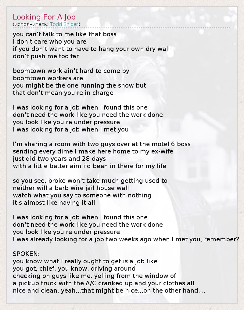 you can't talk to me like that boss I don't care who you are if you don't want to have to hang your own dry wall don't push me too far boomtown work ain't hard to come by boomtown workers are you might be the one running the show but that don't mean you're in charge I was looking for a job when I found this one don't need the work like you need the work done you look like you're under pressure I was looking for a job when I met you I'm sharing a room with two guys over at the motel 6 boss sending every dime I make here home to my ex-wife just did two years and 28 days with a little better aim i'd been in there for my life so you see, broke won't take much getting used to neither will a barb wire jail house wall watch what you say to someone with nothing it's almost like having it all I was looking for a job when I found this one don't need the work like you need the work done you look like you're under pressure I was already looking for a job two weeks ago when I met you, remember? SPOKEN: you know what I really ought to get is a job like you got, chief. you know. driving around checking on guys like me. yelling from the window of a pickup truck with the A/C cranked up and your clothes all nice and clean. yeah...that might be nice...on the other hand....